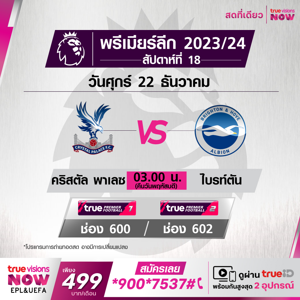Crystal Palace vs Brighton เวลา 03:00 - 05:00 ทางช่อง TPF 1(600) / TPF 2 (602)