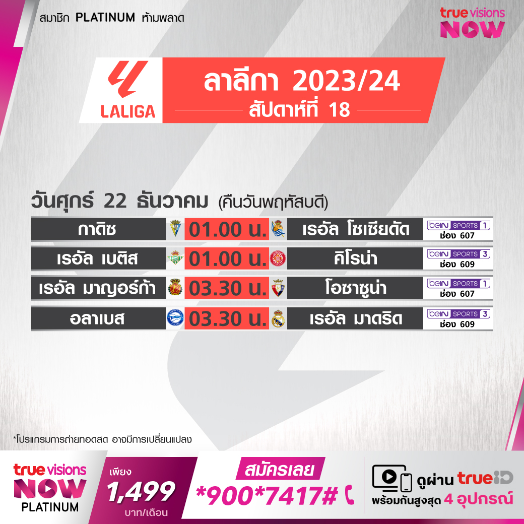 วันนี้มีอะไรดูที่ ทรูวิชั่นส์ ประจำวันพฤหับดีที่ 21 ธันวาคม 66 ในส่วนของฟุตบอลยังมีศึกพรีเมียร์ลีก อังกฤษ, ลา ลีกา สเปน และ ซาอุดิ โปร ลีก ให้ได้ตามเชียร์กันต่อ ส่วนกีฬาอื่นๆ ยังมีกอล์ฟรายการใหญ่ของฝ่ายหญิง เอเชีย แปซิฟิค คัพ 2023 และศึกอเมริกันฟุตบอลเอ็นเอฟแอล งานนี้ ทรูวิชั่นส์ จัดเต็มให้ชมกันถึงบ้าน