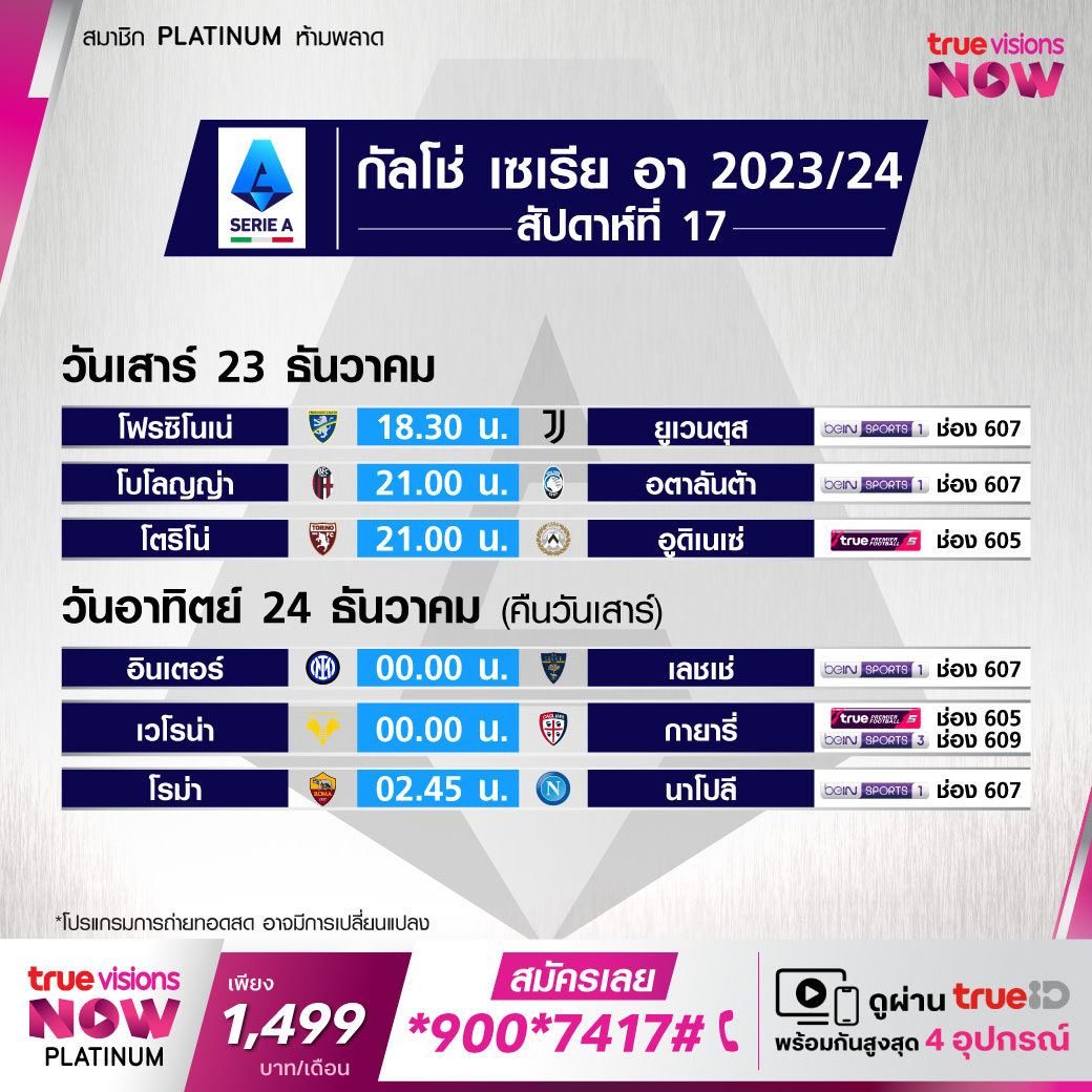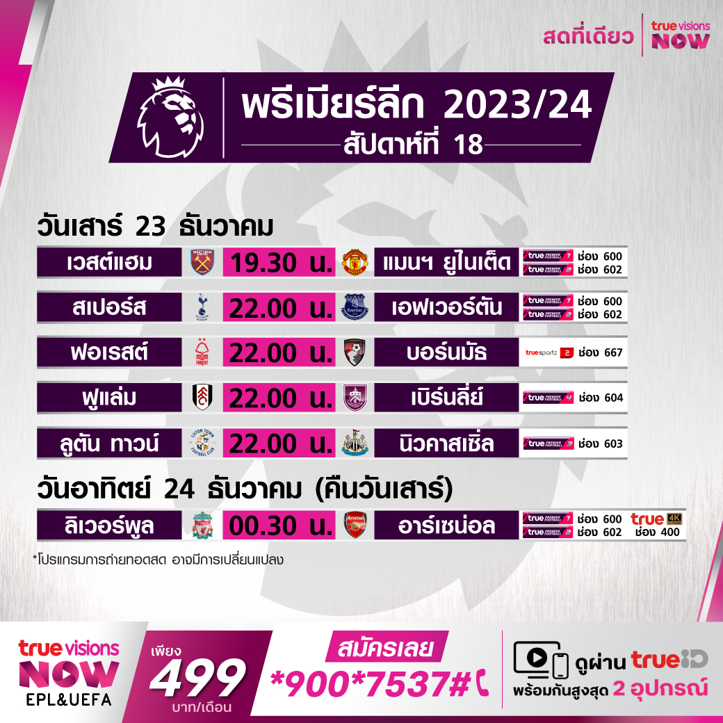 วันนี้มีอะไรดูที่ ทรูวิชั่นส์ ประจำวันเสาร์ที่ 23 ธันวาคม 66 ในส่วนของฟุตบอลยังมีศึกพรีเมียร์ลีก อังกฤษ, กัลโช่ เซเรีย อา อิตาลี, ลา ลีกา สเปน และ ซาอุดิ โปร ลีก ให้ได้ตามเชียร์กันต่อ ส่วนกีฬาอื่นๆ ยังมีกอล์ฟรายการใหญ่ของฝ่ายหญิง เอเชีย แปซิฟิค คัพ 2023, วอลเลย์บอลลีกหญิง โคโว วี-ลีก วีเมนส์, ศึกบาสเกตบอลเอ็นบีเอ และอเมริกันฟุตบอลเอ็นเอฟแอล งานนี้ ทรูวิชั่นส์ จัดเต็มให้ชมกันถึงบ้าน