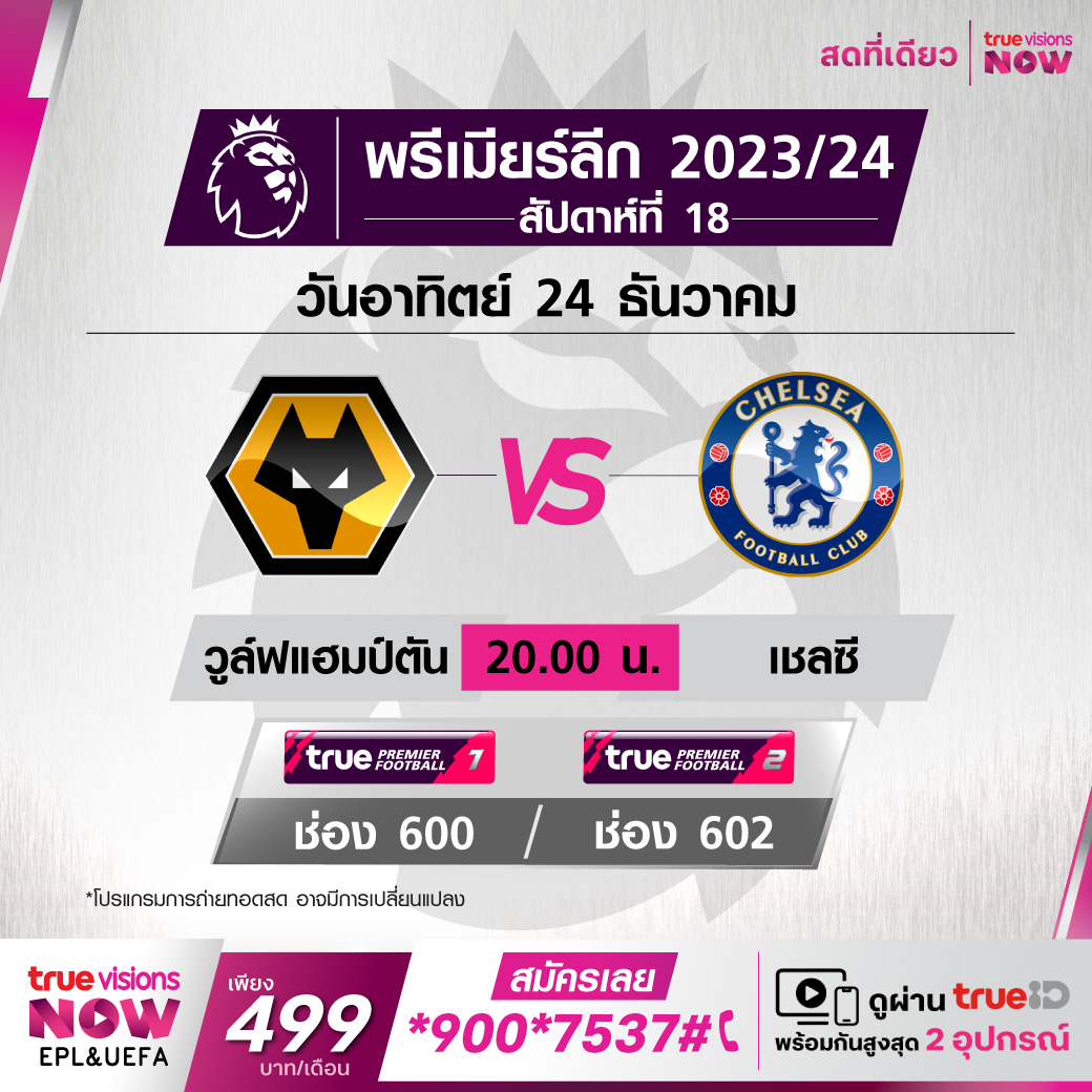 Wolverhampton vs Chelsea เวลา 20:00 - 22:00 ทางช่อง TPF 1(600) / TPF 2 (602)