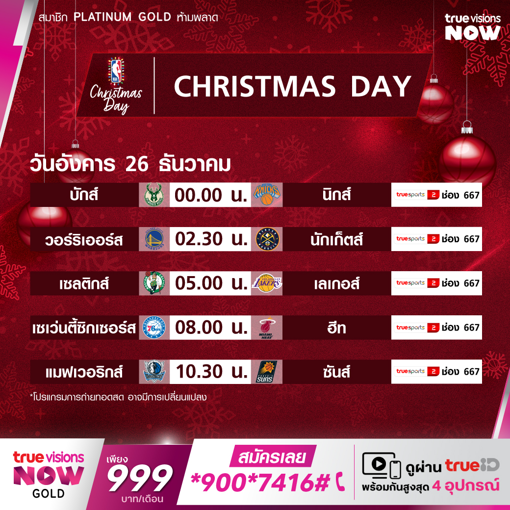 วันนี้มีอะไรดูที่ ทรูวิชั่นส์ ประจำวันจันทร์ที่ 25 ธันวาคม 66 วันคริสต์มาสแบบนี้ ยังมีศึกอเมริกันฟุตบอลเอ็นเอฟแอล และบาสเกตบอลเอ็นบีเอ ให้ได้ติดตามเชียร์กันต่อ งานนี้ ทรูวิชั่นส์ จัดเต็มให้ชมกันถึงบ้าน