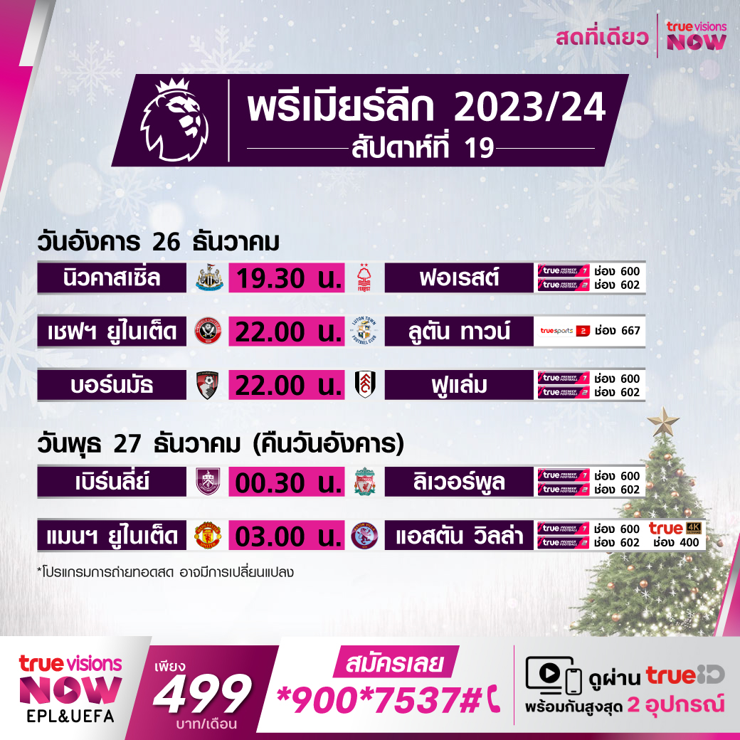 วันนี้มีอะไรดูที่ ทรูวิชั่นส์ ประจำวันอังคารที่ 26 ธันวาคม 66 วันนี้ในส่วนของฟุตบอลยังมียังมีศึกพรีเมียร์ลีก อังกฤษ นัดวันบ็อกซิ่งเดย์ ให้ได้ตามเชียร์กันต่อ รวมถึง ซาอุดิ โปร ลีก งานนี้ ทรูวิชั่นส์ จัดเต็มให้ชมกันถึงบ้าน