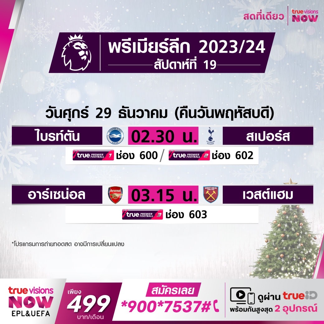 วันนี้มีอะไรดูที่ ทรูวิชั่นส์ ประจำวันพฤหัสบดีที่ 28 ธันวาคม 66 ในส่วนของฟุตบอลยังมียังมีศึกพรีเมียร์ลีก อังกฤษ ให้ได้ตามเชียร์กันต่อ ขณะที่คออเมริกันเกมส์ยังมีศึกอเมริกันฟุตบอลเอ็นเอฟแอล งานนี้ ทรูวิชั่นส์ จัดเต็มให้ชมกันถึงบ้าน