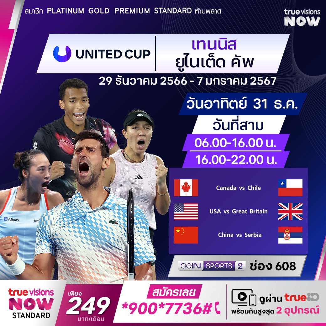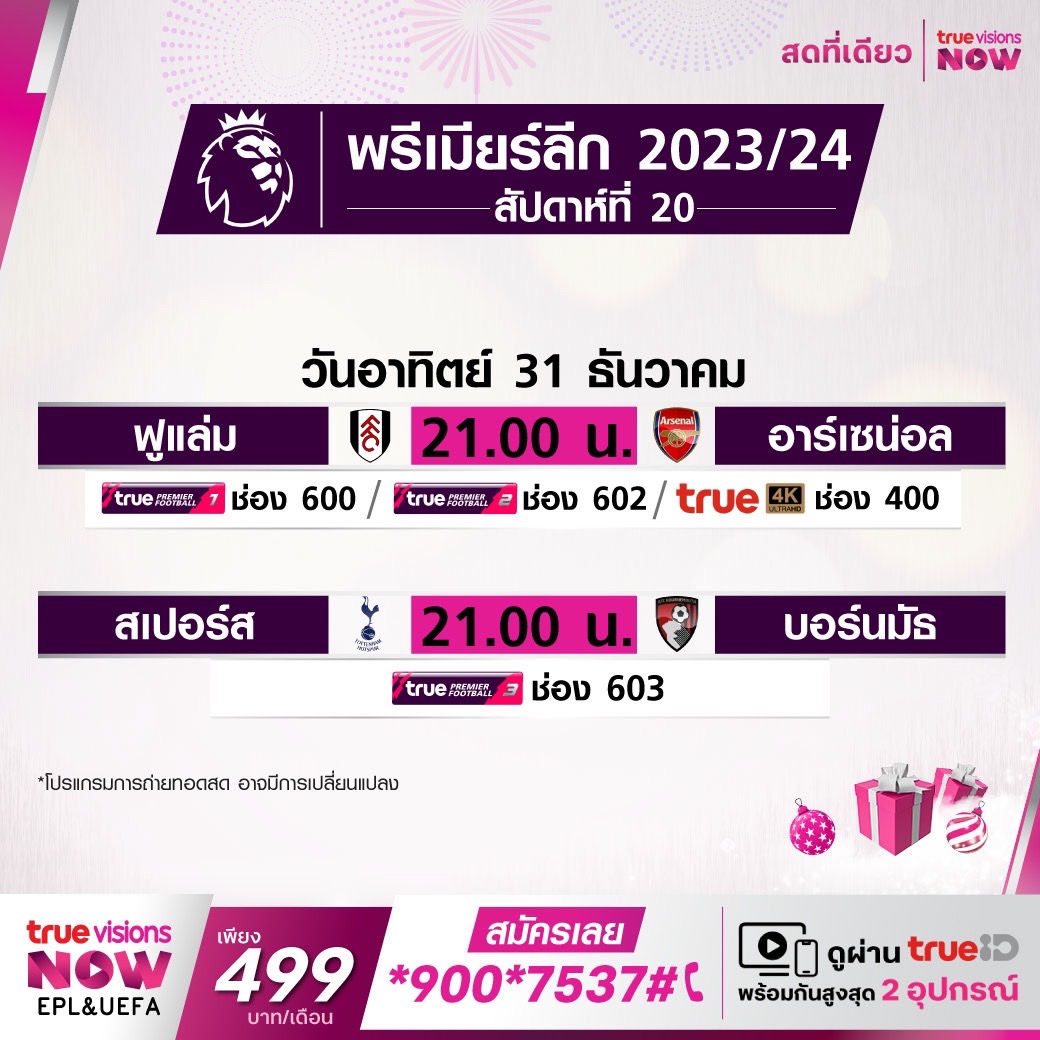 วันนี้มีอะไรดูที่ ทรูวิชั่นส์ ประจำวันอาทิตย์ที่ 31 ธันวาคม 66 ในส่วนของฟุตบอลยังมีศึกพรีเมียร์ลีก อังกฤษ ให้ได้ตามเชียร์กันต่อ ขณะที่กีฬาอื่นๆ ยังมีศึกเทนนิส ยูไนเต็ด คัพ และอเมริกันฟุตบอลเอ็นเอฟแอล งานนี้ ทรูวิชั่นส์ จัดเต็มให้ชมกันถึงบ้าน