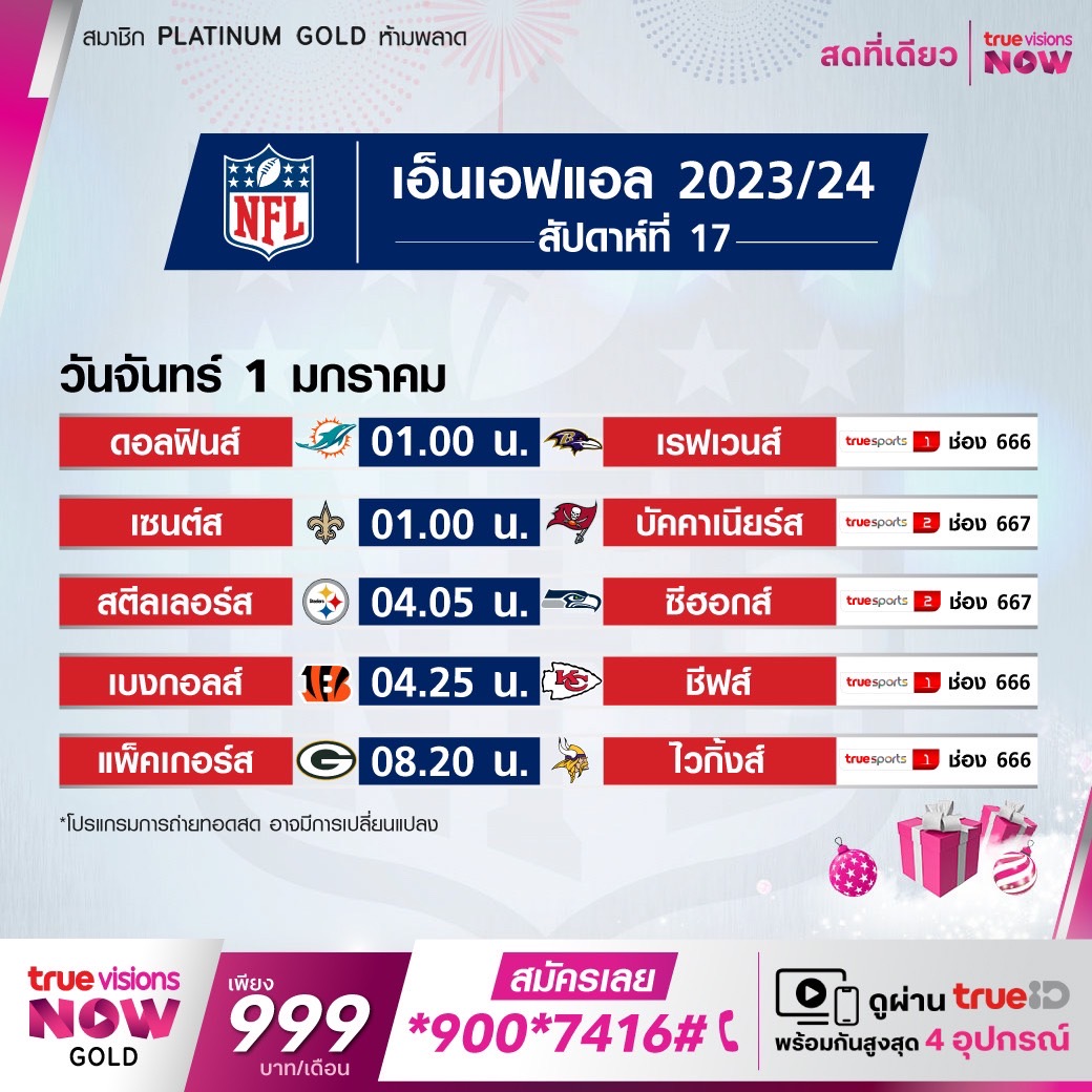 วันจันทร์ 1 ม.ค. Packers Vs Vikings เวลา 08.20 ทางช่อง TS 1(666)