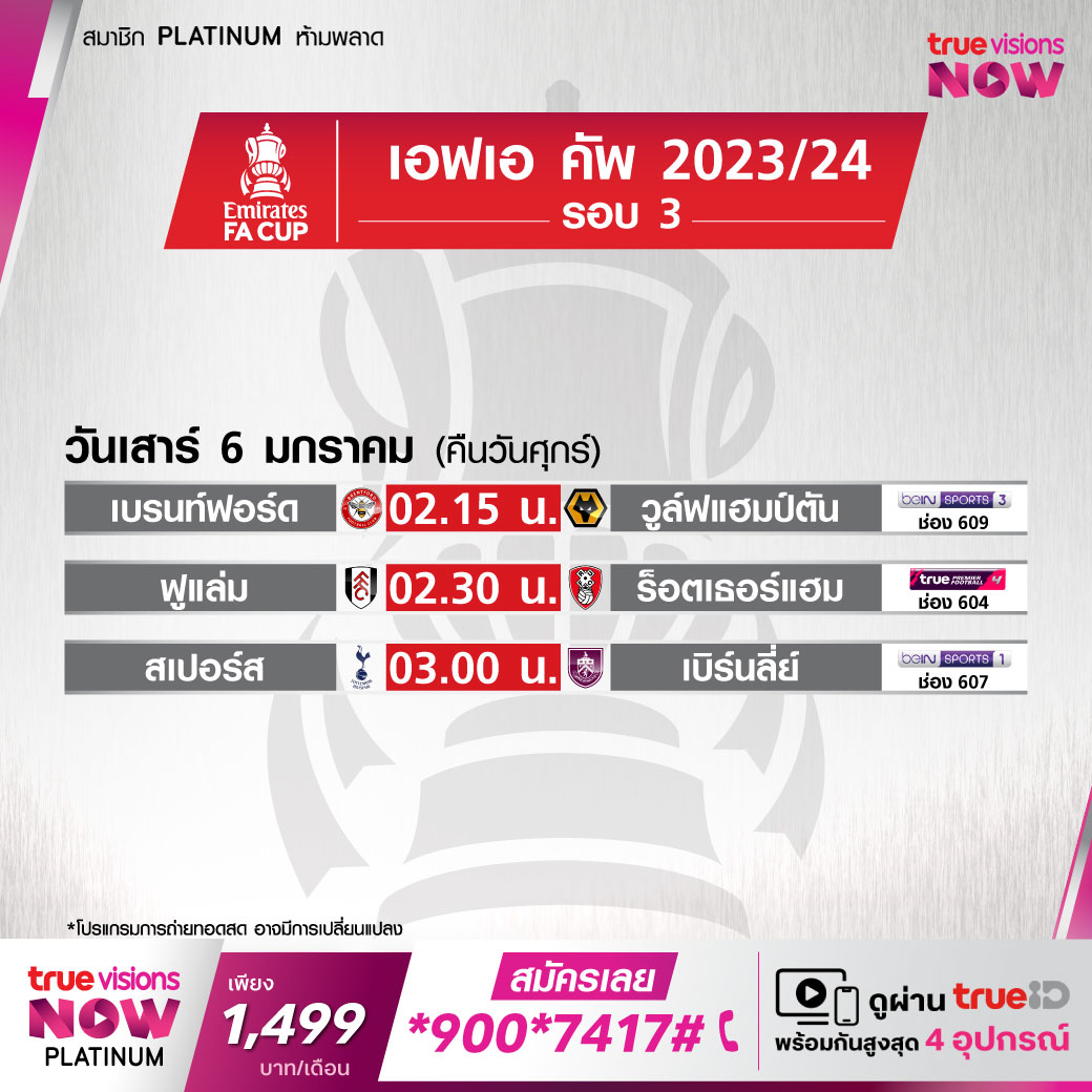 วันนี้มีอะไรดูที่ ทรูวิชั่นส์ ประจำวันศุกร์ที่ 5 มกราคม 67 ในส่วนของฟุตบอลยังมีศึก เอฟเอ คัพ อังกฤษ รอบ 3 และ กัลโช่ เซเรีย อา อิตาลี ให้ได้ตามเชียร์กันต่อ ขณะที่กีฬาอื่นๆ ยังมีศึกเทนนิส ยูไนเต็ด คัพ, เอทีพี ทัวร์ และ ดับเบิ้ลยูทีเอ ทัวร์ รายการ บริสเบน อินเตอร์เนชั่นแนล, ดับเบิ้ลยูทีเอ ทัวร์ รายการ ออคแลนด์ คลาสสิค, กอล์ฟ พีจีเอ ทัวร์ รายการ เดอะ เซนทรี่ และศึกบาสเกตบอล เอ็นบีเอ งานนี้ ทรูวิชั่นส์ จัดเต็มให้ชมกันถึงบ้าน