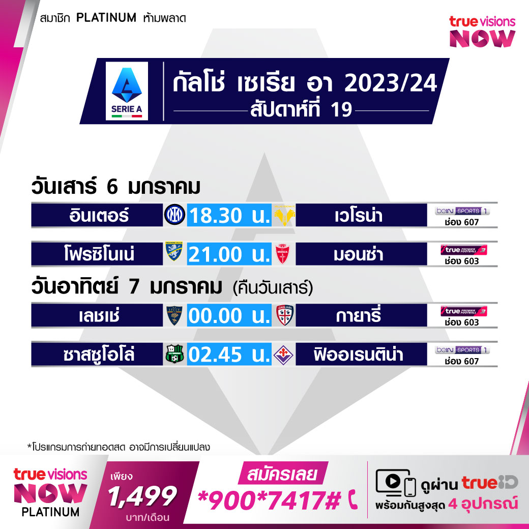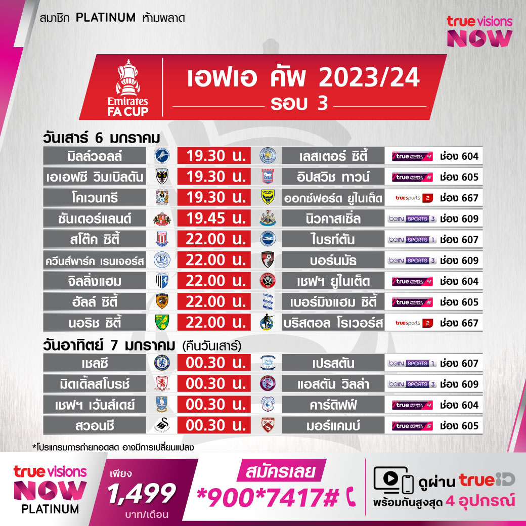 วันนี้มีอะไรดูที่ ทรูวิชั่นส์ ประจำวันเสาร์ที่ 6 มกราคม 67 ในส่วนของฟุตบอลยังมีศึก เอฟเอ คัพ อังกฤษ รอบ 3 และ กัลโช่ เซเรีย อา อิตาลี ให้ได้ตามเชียร์กันต่อ ขณะที่กีฬาอื่นๆ ยังมีศึกเทนนิส ยูไนเต็ด คัพ, เอทีพี ทัวร์ และ ดับเบิ้ลยูทีเอ ทัวร์ รายการ บริสเบน อินเตอร์เนชั่นแนล, ดับเบิ้ลยูทีเอ ทัวร์ รายการ ออคแลนด์ คลาสสิค, กอล์ฟ พีจีเอ ทัวร์ รายการ เดอะ เซนทรี่, ศึกอเมริกันฟุตบอลเอ็นเอฟแอล และศึกบาสเกตบอล เอ็นบีเอ งานนี้ ทรูวิชั่นส์ จัดเต็มให้ชมกันถึงบ้าน