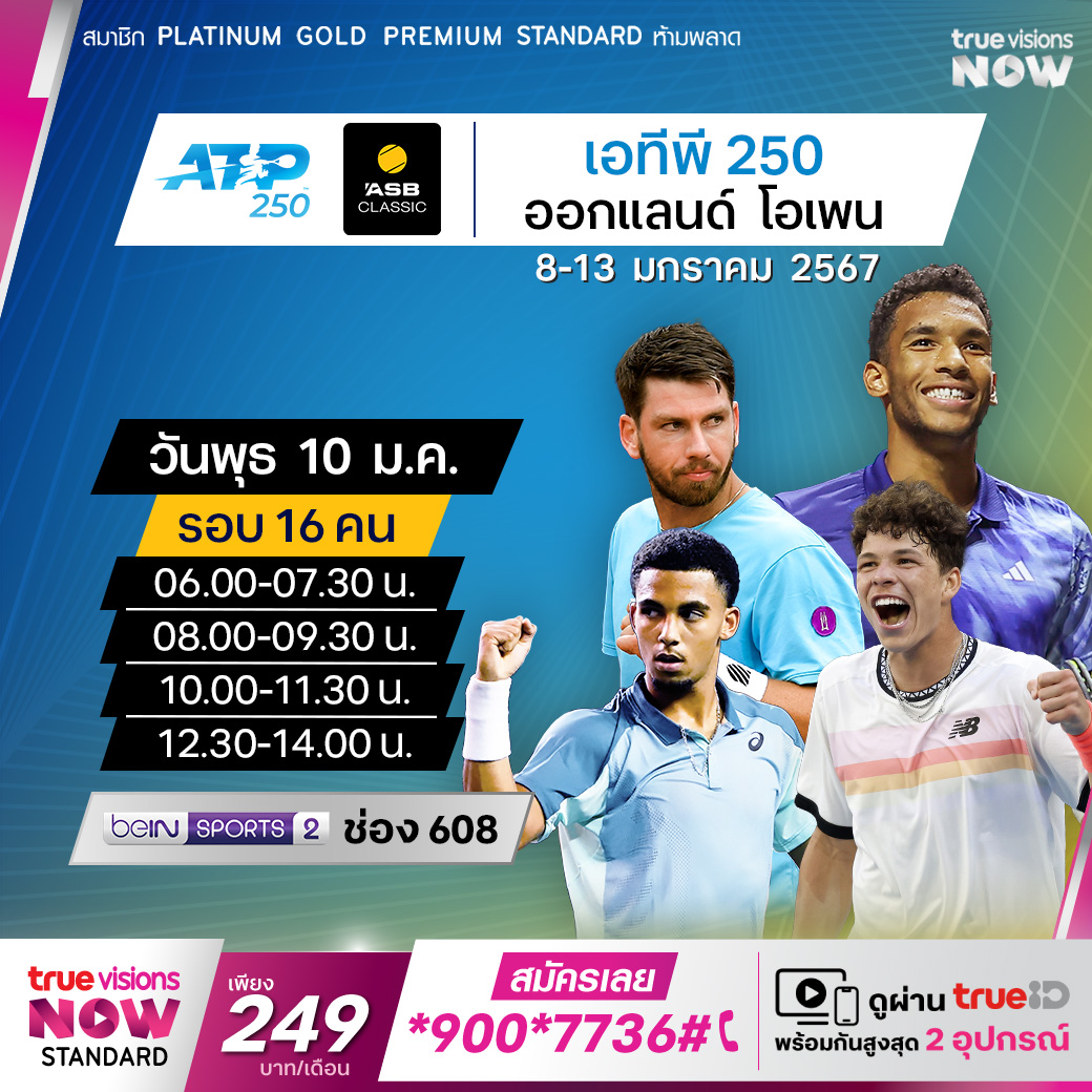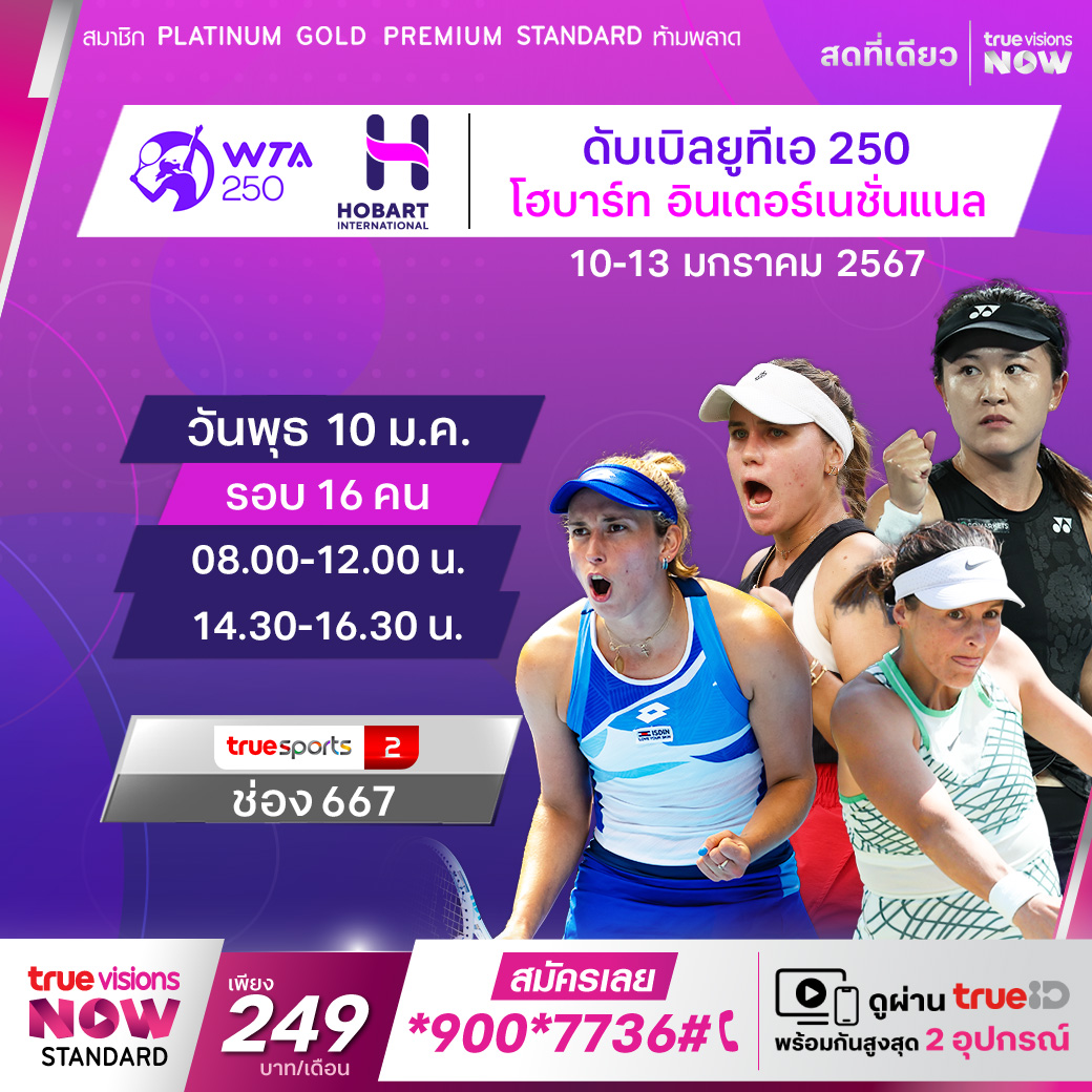 วันนี้มีอะไรดูที่ ทรูวิชั่นส์ ประจำวันพุธที่ 10 มกราคม 67 ยังคงมีกีฬาที่น่าสนใจให้ได้ตามลุ้นตามเชียร์มากมายเหมือนเดิม โดยในส่วนของเทนนิสยังมีศึก คูยอง คลาสสิก รายการอุ่นเครื่องก่อนหน้าศึกออสเตรเลียน โอเพ่น, เอทีพี ทัวร์ รายการ ออคแลนด์ คลาสสิค, ดับเบิ้ลยูทีเอ ทัวร์ รายการ อดิเลด อินเตอร์เนชั่นแนล และ โฮบาร์ท อินเตอร์เนชั่นแนล, ศึกแบดมินตัน บีดับเบิ้ลยูเอฟ รายการ มาเลเซีย โอเพ่น และ ศึกเวิลด์ สนุกเกอร์ รายการมาสเตอร์ส งานนี้ ทรูวิชั่นส์ จัดเต็มให้ชมกันถึงบ้าน