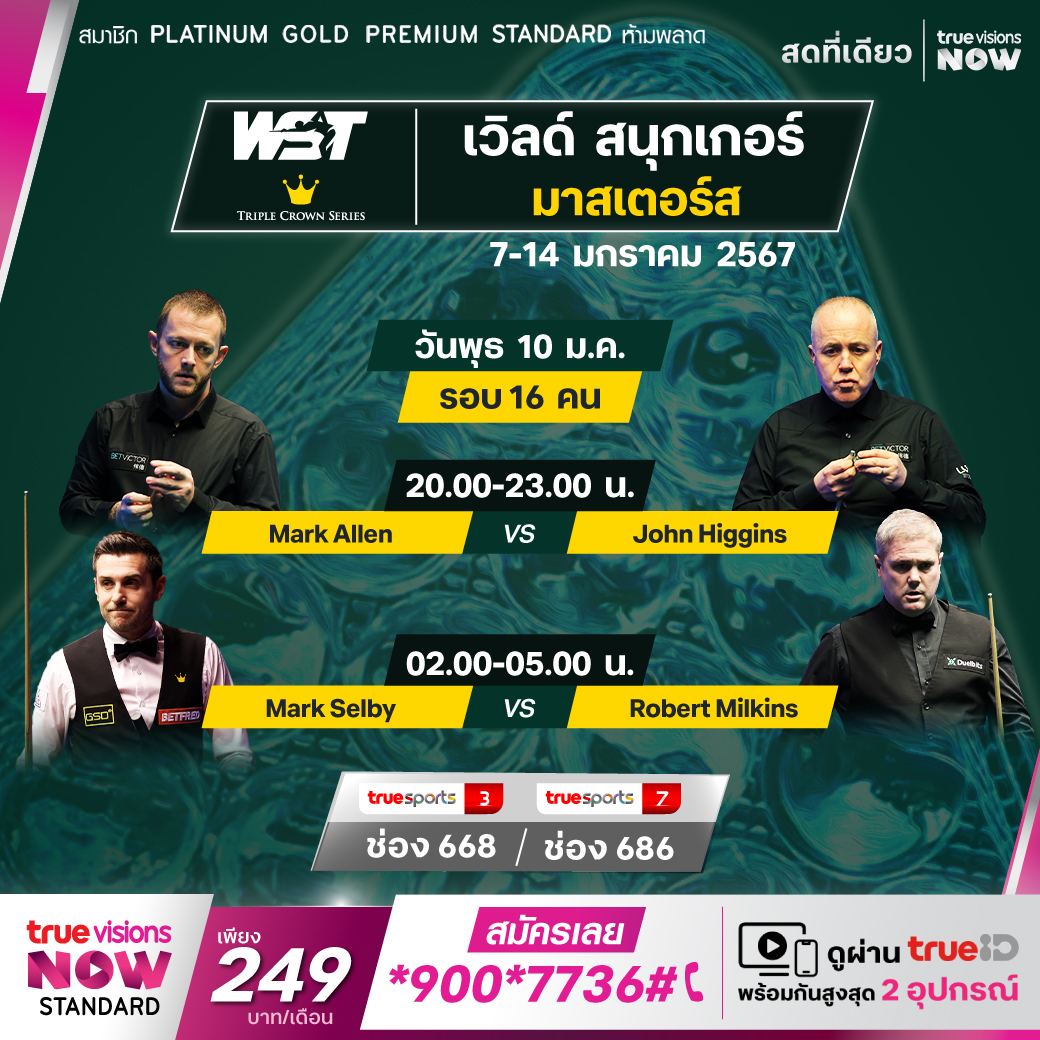 เวิลด์ สนุกเกอร์ ทัวร์ รายการแรกของปี 2024 กับศึกมาสเตอร์ส ความยิ่งใหญ่ระดับ ทริปเปิ้ล คราวน์ ซีรี่ส์ ที่ไม่เป็นสองรองใคร เฟรมต่อเฟรม แมตช์ต่อแมตช์ ใครจะก้าวขึ้นเป็นแชมป์ที่มีเพียงหนึ่งเดียว ชมครบทุกแมตช์ จุใจ เอ็กซ์คลูซีฟ ที่ ทรูวิชั่นส์ ที่เดียว