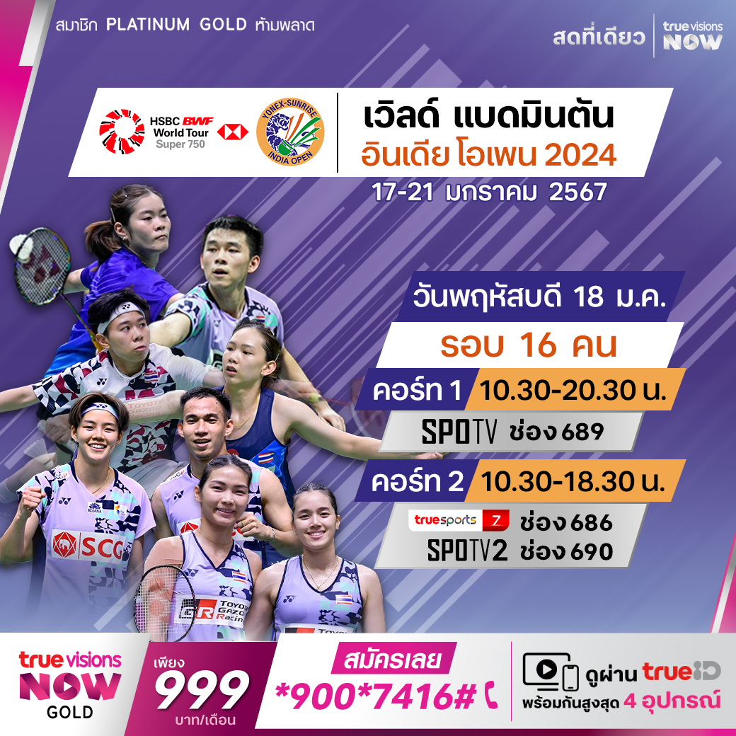 แบดมินตัน เวิลด์ ทัวร์ ซูเปอร์ 750 อินเดีย โอเพ่น ที่กรุงนิว เดลลี ชิงแชมป์ทั้ง 5 ประเภท และเงินรางวัลรวม 850,000 เหรียญสหรัฐฯ ร่วมเชียร์ทีมแบดมินตันไทยและมือท็อปๆ ของโลกแย่งแชมป์กันแบบจุใจ รอบแรกถึงรอบชิงชนะเลิศ แบบเอ็กซ์คลูซีฟ ที่เดียว ที่ ทรูวิชั่นส์