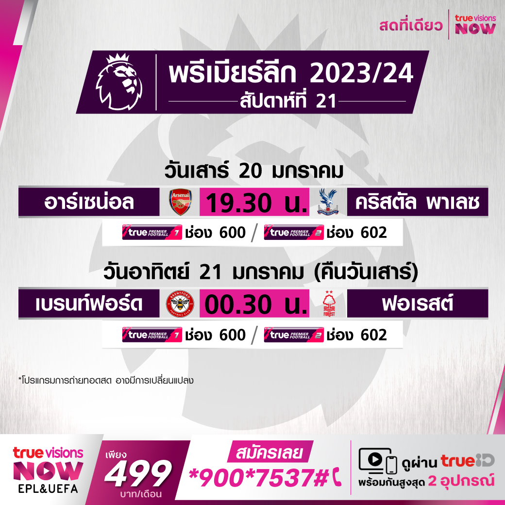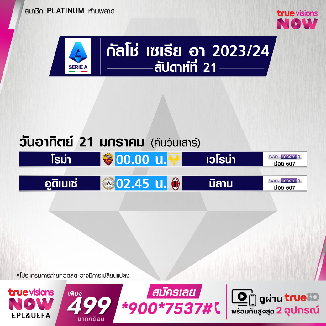 วันนี้มีอะไรดูที่ ทรูวิชั่นส์ ประจำวันเสาร์ที่ 20 มกราคม 67 ยังคงมีกีฬาที่น่าสนใจให้ได้ตามลุ้นตามเชียร์มากมายเหมือนเดิม โดยในส่วนของฟุตบอลนั้นยังมีศึกพรีเมียร์ลีก อังกฤษ, กัลโช่ เซเรีย อา อิตาลี, บุนเดสลีกา เยอรมนี, ลา ลีกา สเปน และ แอฟริกา คัพ ออฟ เนชั่นส์ ให้ได้ตามเชียร์กันต่อ ส่วนกีฬาอื่นๆ พลาดไม่ได้กับศึกเทนนิส ออสเตรเลียน โอเพ่น แกรนด์สแลมแรกของปี, กอล์ฟ พีจีเอ ทัวร์ รายการ ดิ อเมริกัน เอ็กซ์เพรส, ดีพี เวิลด์ ทัวร์ รายการ ฮีโร่ ดูไบ เดสเสิร์ท คลาสสิก, พีจีเอ ทัวร์ แชมเปี้ยนส์ รายการ มิตซูบิชิ อิเล็กทริค แชมเปี้ยนชิพ แอลพีจีเอ ทัวร์ รายการ ฮิลตัน แกรนด์ โวเคชั่นส์ ทัวร์นาเมนต์ ออฟ แชมเปี้ยนส์, แบดมินตัน บีดับเบิ้ลยูเอฟ รายการ อินเดีย โอเพ่น, เวิลด์ สนุกเกอร์ รายการ เวิลด์ กรังด์ปรีซ์, ศึกยูเอฟซี, ศึกอเมริกันฟุตบอลเอ็นเอฟแอล และศึกบาสเกตบอลเอ็นบีเอ งานนี้ ทรูวิชั่นส์ จัดเต็มให้ชมกันถึงบ้าน