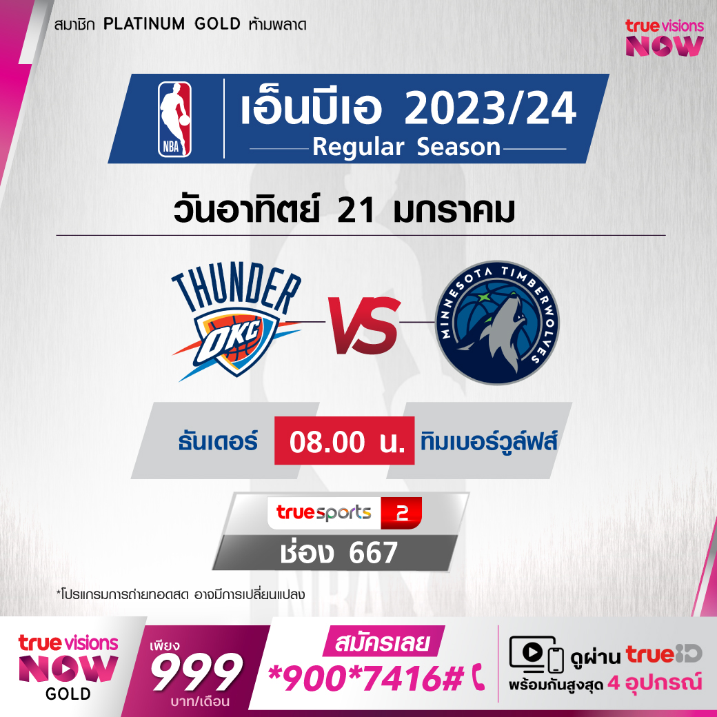 วันอาทิตย์ 21 ม.ค. Thunders Vs Timberwolves เวลา 08.00 ทางช่อง TS 2 (667)