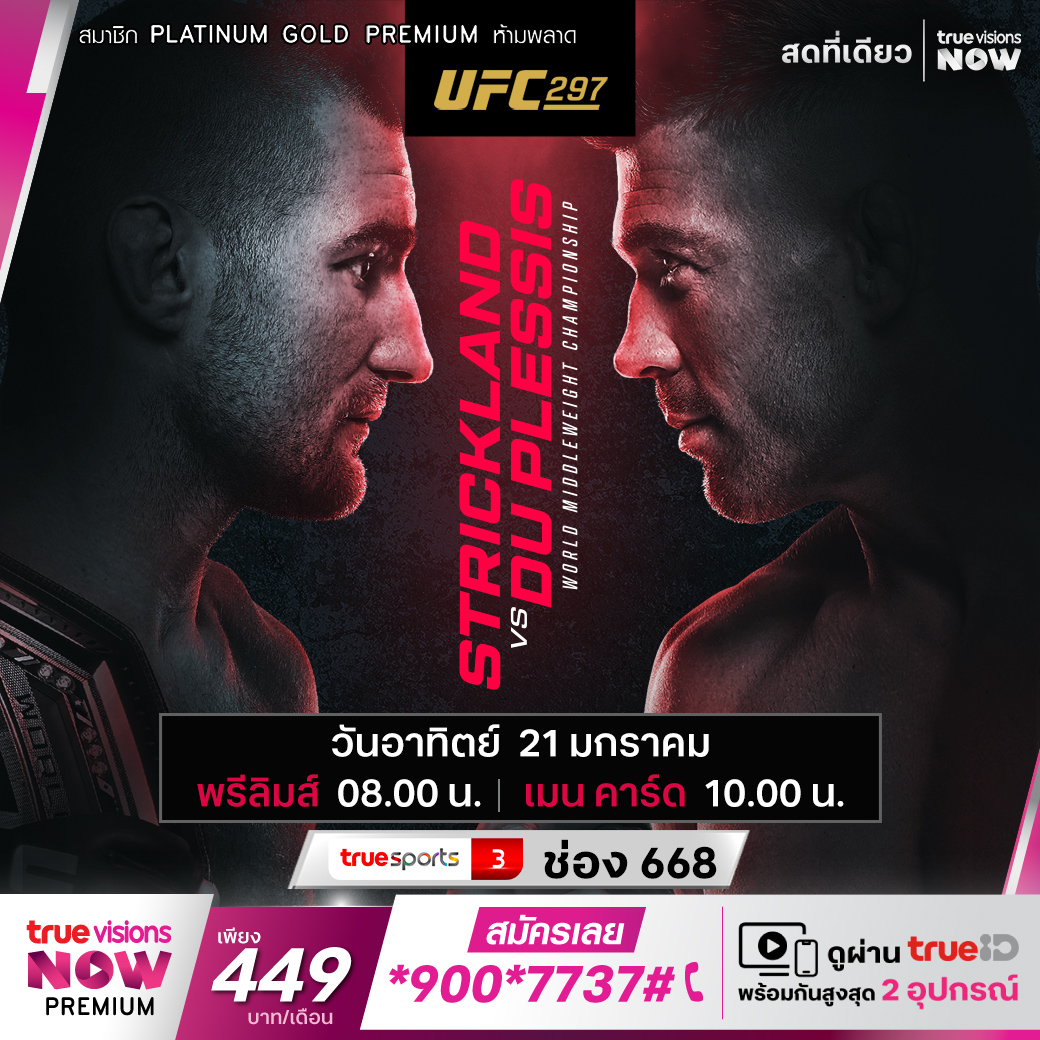 มาถึงแล้ว ศึกใหญ่ที่สุดที่แฟนๆ เฝ้ารอคอย สำหรับการต่อสู้ในกรงเหล็ก ยูเอฟซี 297 ฌอน ทาร์ซาน สตริคแลนด์ จอมพลิกล็อก ที่กระชากเข็มขัดแขมป์มิดเดิ้ลเวตมาจากเอวของ อิสราเอล อเดซานยา จะป้องกันตำแหน่งครั้งแรกกับผู้ท้าชิงสุดอันตรายจากแอฟริกาใต้ ดรายคัส ดู เพลซีส์ สดจุใจเอ็กซ์คลูซีฟ ทั้งช่วงพรีลิมส์ และ เมนคาร์ด จากสกอตเทียแบงค์ รีน่าใน โตรอนโต้ แคนาดา ที่เดียว ทางทรูวิชั่นส์