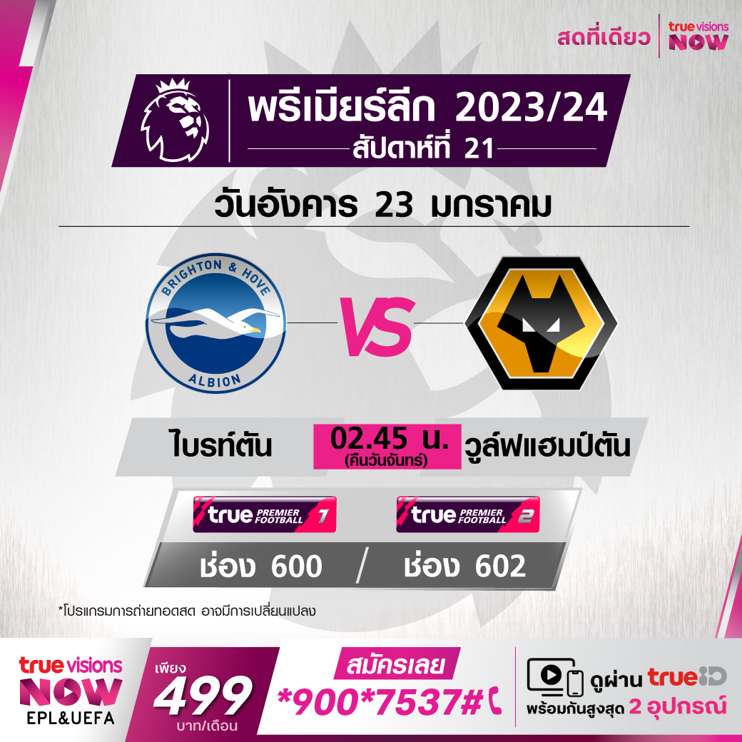 Brighton vs Wolverhampton เวลา 02:45 - 04:45 ทางช่อง TPF 1(600) / TPF 2 (602)