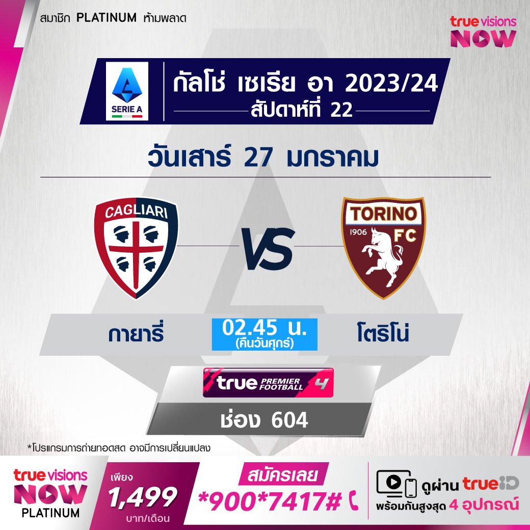 Cagliari vs Torino เวลา 02.45-04.45 ทางช่อง TPF 4 (604)