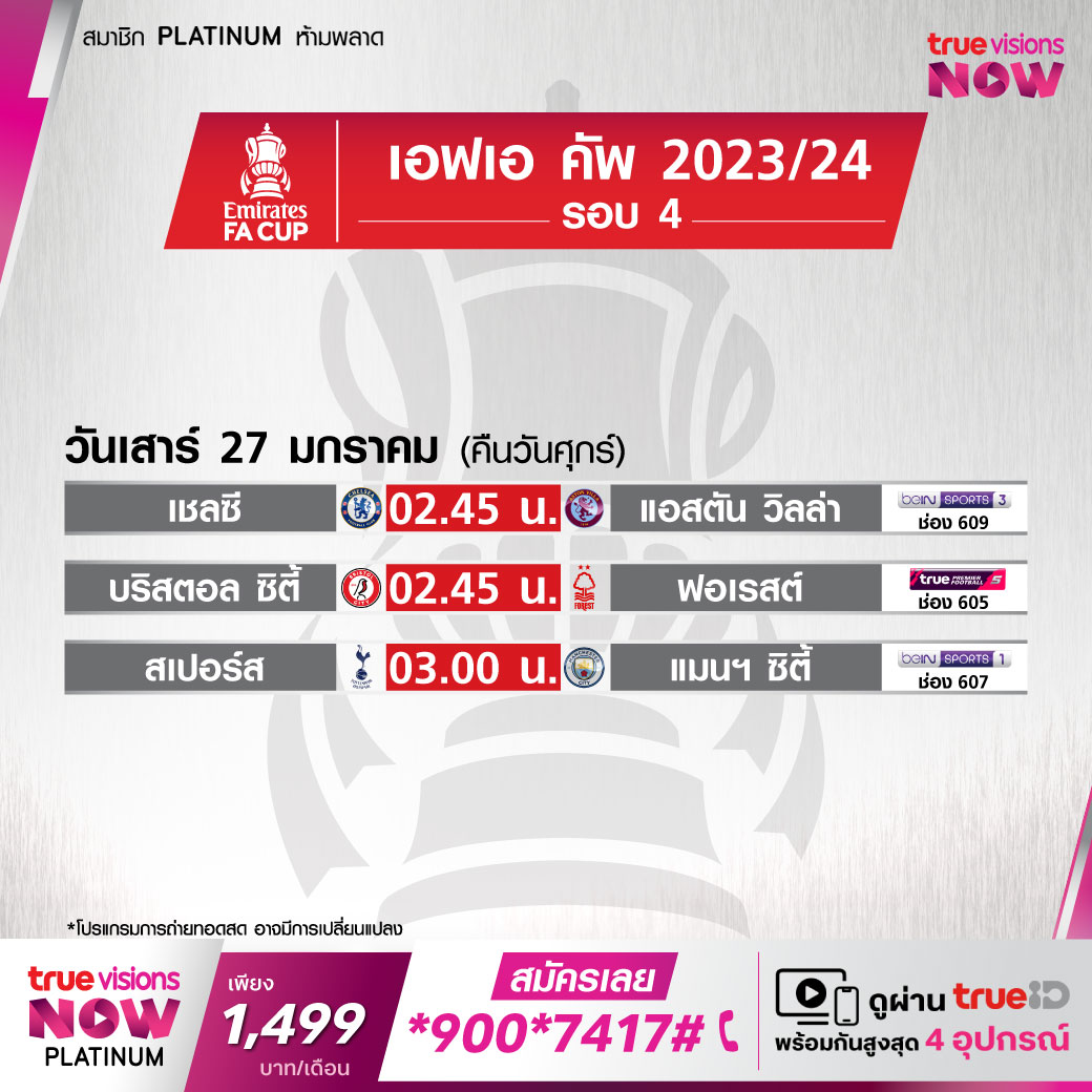 วันนี้มีอะไรดูที่ ทรูวิชั่นส์ ประจำวันศุกร์ที่ 26 มกราคม 67 ยังคงมีกีฬาที่น่าสนใจให้ได้ตามลุ้นตามเชียร์มากมายเหมือนเดิม โดยในส่วนของฟุตบอลนั้นยังมีศึกเอฟเอ คัพ อังกฤษ รอบที่ 4, กัลโช่ เซเรีย อา อิตาลี, บุนเดสลีกา เยอรมนี และ ลา ลีกา สเปน ให้ได้ตามเชียร์กันต่อ ส่วนกีฬาอื่นๆ พลาดไม่ได้กับศึกเทนนิส ออสเตรเลียน โอเพ่น แกรนด์สแลมแรกของปี, กอล์ฟ พีจีเอ ทัวร์ รายการ ฟาร์เมอร์ส อินชัวรันซ์ โอเพ่น, ดีพี เวิลด์ ทัวร์ รายการ ราส อัล ไคมาร์ แชมเปี้ยนชิพ และ แอลพีจีเอ ทัวร์ รายการ ไดรฟ์ ออน แชมเปี้ยนชิพ, แบดมินตัน บีดับเบิ้ลยูเอฟ รายการ อินโดนีเซีย มาสเตอร์ส และศึกบาสเกตบอลเอ็นบีเอ งานนี้ ทรูวิชั่นส์ จัดเต็มให้ชมกันถึงบ้าน