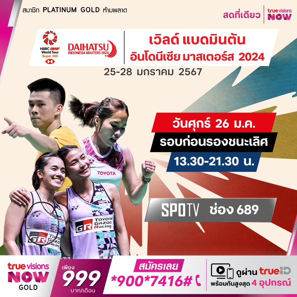 แบดมินตัน เก็บคะแนนสะสมโลก อินโดนีเซีย มาสเตอร์ส ทัวร์นาเมนท์ระดับ เวิลด์ ทัวร์ ซูเปอร์ 500 ที่บรรดาซูเปอร์สตาร์เจ้าถิ่นปักหลักแย่งแชมป์กับนักแบดมินตันไทยและจากทั่วโลก ชมสดจุใจ แบบเอ็กซ์คลูซีฟ ที่ ทรูวิชั่นส์