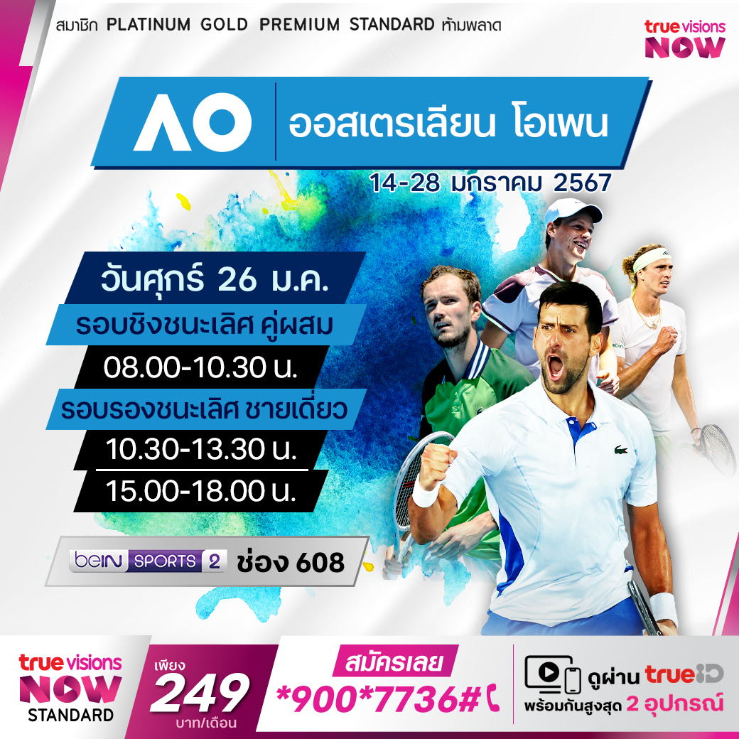 การแข่งขันเทนนิสแกรนด์สแลมแรกของปี 2024 ศึกออสเตรเลียน โอเพ่น มาถึงในรอบชิงชนะเลิศในประเภทคู่ผสม และรอบรองชนะเลิศชายเดี่ยวแล้ว ชมและเชียร์นักเทนนิสระดับโลก ใครจะคว้าแชมป์ในปีนี้ไปครองทั้งฝ่ายชายและหญิง ติดตามชมการถ่ายทอดสดทาง ทรูวิชั่นส์ ที่เดียวเท่านั้น