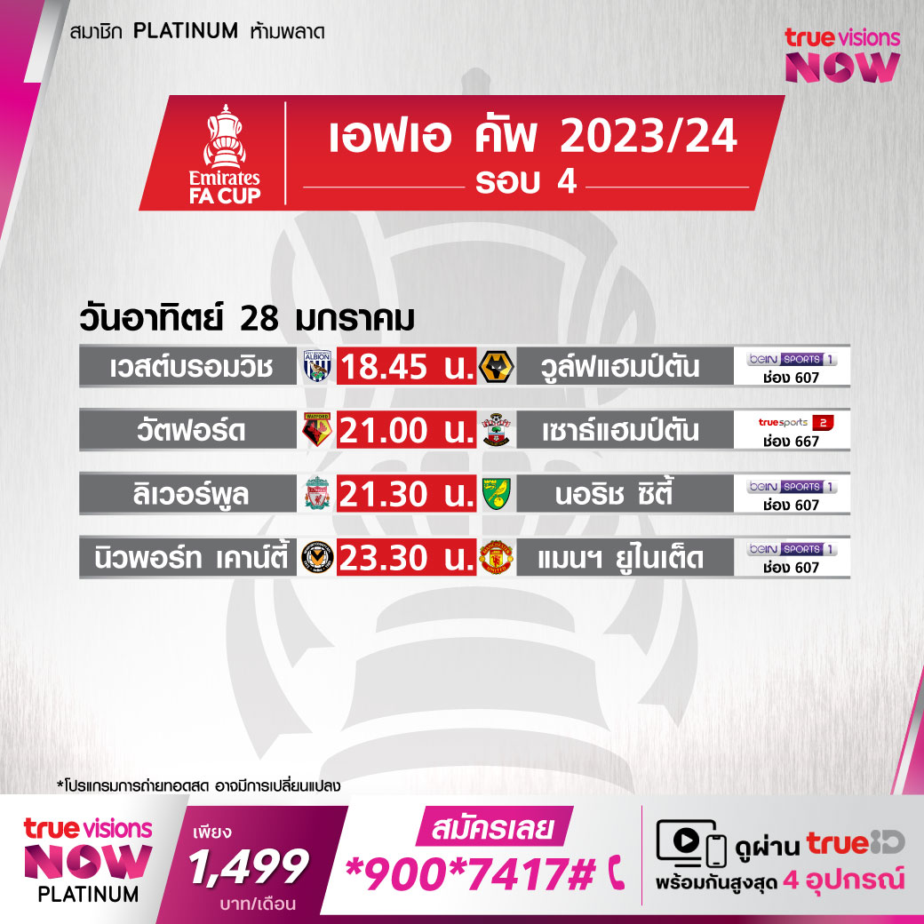 วันนี้มีอะไรดูที่ ทรูวิชั่นส์ ประจำวันอาทิตย์ที่ 28 มกราคม 67 ยังคงมีกีฬาที่น่าสนใจให้ได้ตามลุ้นตามเชียร์มากมายเหมือนเดิม โดยในส่วนของฟุตบอลนั้นยังมีศึกเอฟเอ คัพ อังกฤษ รอบที่ 4, กัลโช่ เซเรีย อา อิตาลี, บุนเดสลีกา เยอรมนี, ลา ลีกา สเปน และ ลีก เอิง ฝรั่งเศส ให้ได้ตามเชียร์กันต่อ ส่วนกีฬาอื่นๆ พลาดไม่ได้กับศึกเทนนิส ออสเตรเลียน โอเพ่น แกรนด์สแลมแรกของปี, กอล์ฟ พีจีเอ ทัวร์ รายการ ฟาร์เมอร์ส อินชัวรันซ์ โอเพ่น, ดีพี เวิลด์ ทัวร์ รายการ ราส อัล ไคมาร์ แชมเปี้ยนชิพ และ แอลพีจีเอ ทัวร์ รายการ ไดรฟ์ ออน แชมเปี้ยนชิพ, แบดมินตัน บีดับเบิ้ลยูเอฟ รายการ อินโดนีเซีย มาสเตอร์ส และศึกบาสเกตบอลเอ็นบีเอ งานนี้ ทรูวิชั่นส์ จัดเต็มให้ชมกันถึงบ้าน