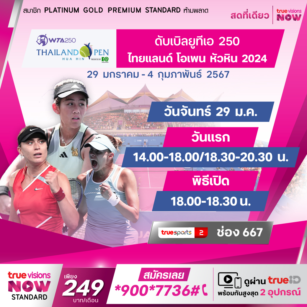 พบกับรายการเทนนิสหญิงรายการที่ใหญ่ที่สุดในประเทศไทยและเอเชียตะวันออกเฉียงใต้ กับรายการ ไทยแลนด์ โอเพ่น จาก อ. หัวหิน จ. ประจวบคีรีขันธ์ เมืองท่องเที่ยวชื่อดังระดับโลก ร่วมลุ้นกันว่านักเทนนิสหญิงคนไหนจะคว้าแชมป์ไปครอง ชมสด ทางทรูวิชั่นส์ ที่เดียว
