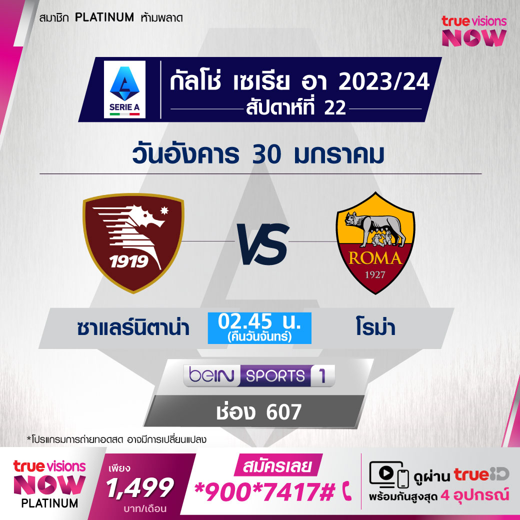 Salernitana vs Roma เวลา 02.45-04.45 ทางช่อง beIN 1 (607)