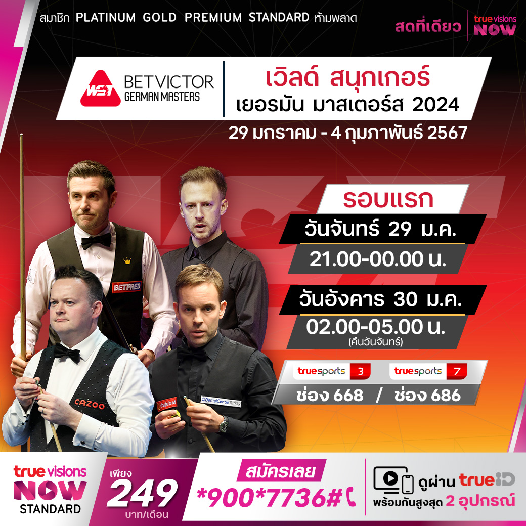 แฟนๆ กีฬาสนุกเกอร์พลาดไม่ได้ เมื่อสุดยอดนักสอยคิวระดับท็อปๆ ของโลก ตบเท้าบุกกรุง เบอร์ลิน ประเทศเยอรมัน ทำศึกสำคัญเวิลด์ สนุกเกอร์เก็บคะแนนสะสมโลก รายการ เยอรมัน มาสเตอร์ส 2024 ท่ามกลางบรรยากาศของแฟนๆ ที่คับคั่งเต็มความจุสนาม ใครจะก้าวขึ้นมาเป็นแชมป์ปีนี้ ชมสด ตั้งแต่รอบแรก ถึงรอบชิงชนะเลิศ แบบเอ็กซ์คลูซีฟ ที่ ทรูวิชั่นส์ ที่เดียว