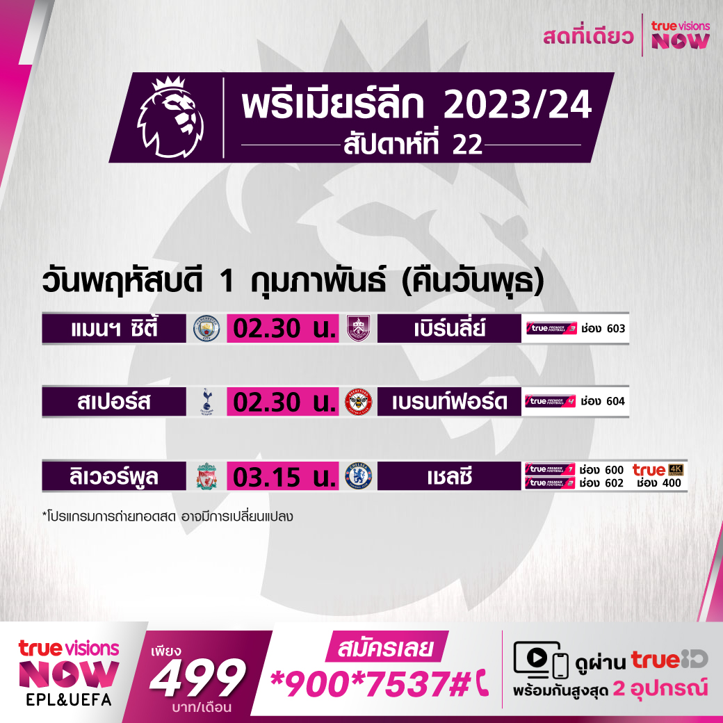 วันนี้มีอะไรดูที่ ทรูวิชั่นส์ ประจำวันพุธที่ 31 มกราคม 67 ยังคงมีกีฬาที่น่าสนใจให้ได้ตามลุ้นตามเชียร์มากมายเหมือนเดิม โดยในส่วนของฟุตบอลนั้นยังมีศึกพรีเมียร์ลีก อังกฤษ ให้ได้ตามเชียร์กันต่อ ส่วนกีฬาอื่นๆ ยังมีศึกเทนนิส ดับเบิ้ลยูทีเอ ทัวร์ รายการ ออสเตรีย เลดี้ส์ ลินซ์ และ ไทยแลนด์ โอเพ่น รวมถึงศึกเวิลด์ สนุกเกอร์ รายการ เยอรมัน มาสเตอร์ส งานนี้ ทรูวิชั่นส์ จัดเต็มให้ชมกันถึงบ้าน