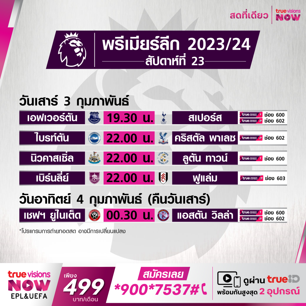 วันนี้มีอะไรดูที่ ทรูวิชั่นส์ ประจำวันศุกร์ที่ 2 กุมภาพันธ์ 67 ยังคงมีกีฬาที่น่าสนใจให้ได้ตามลุ้นตามเชียร์มากมายเหมือนเดิม โดยในส่วนของฟุตบอลนั้นยังมีศึกพรีเมียร์ลีก อังกฤษ, กัลโช่ เซเรีย อา อิตาลี, บุนเดสลีกา เยอรมนี, ลา ลีกา สเปน และ ลีก เอิง ฝรั่งเศส ให้ได้ตามเชียร์กันต่อ ส่วนกีฬาอื่นๆ ยังมีศึกเทนนิส เดวิส คัพ รอบคัดเลือก, ดับเบิ้ลยูทีเอ ทัวร์ รายการ ออสเตรีย เลดี้ส์ ลินซ์ และ ไทยแลนด์ โอเพ่น, กอล์ฟ พีจีเอ ทัวร์ รายการ เอทีแอนด์ที เพ็บเบิ้ล บีช โปรแอม 2024, ดีพี เวิลด์ ทัวร์ รายการ บาห์เรน แชมเปี้ยนชิพ, แบดมินตัน บีดับเบิ้ลยูเอฟ รายการ ปรินเซส สิริวัณณวรี ไทยแลนด์ มาสเตอร์ส 2024, ศึกยูเอฟซี ไฟต์ ไนท์, เวิลด์ สนุกเกอร์ รายการ เยอรมัน มาสเตอร์ส, ศึก รักบี้ ซิกซ์ เนชั่นส์ 2024 และบาสเกตบอลเอ็นบีเอ งานนี้ ทรูวิชั่นส์ จัดเต็มให้ชมกันถึงบ้าน