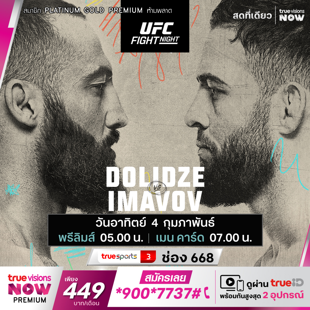 ดุเดือด เลือดพล่าน มันส์สะใจตามสไตล์ ยูเอฟซี สัปดาห์นี้ที่สังเวียน ยูเอฟซี เอเพ็กซ์ ลาสเวกัส กับศึก ยูเอฟซี ไฟต์ ไนท์ คู่เอกรุ่นมิดเดิ้ลเวต โรมัน โดลิดเซ่ จอมโหดจากจอร์เจีย รองแชมป์อันดับ 8 ของรุ่น ปะทะ นัสซอร์ดีน อิวามอฟ นักสู้จากแดนน้ำหอม ฝรั่งเศส สดจุใจ เอ็กซ์คลูซีฟ ครบทั้งช่วงพรีลิมส์ และ เมน คาร์ด ที่เดียวที่ ทรูวิชั่นส์