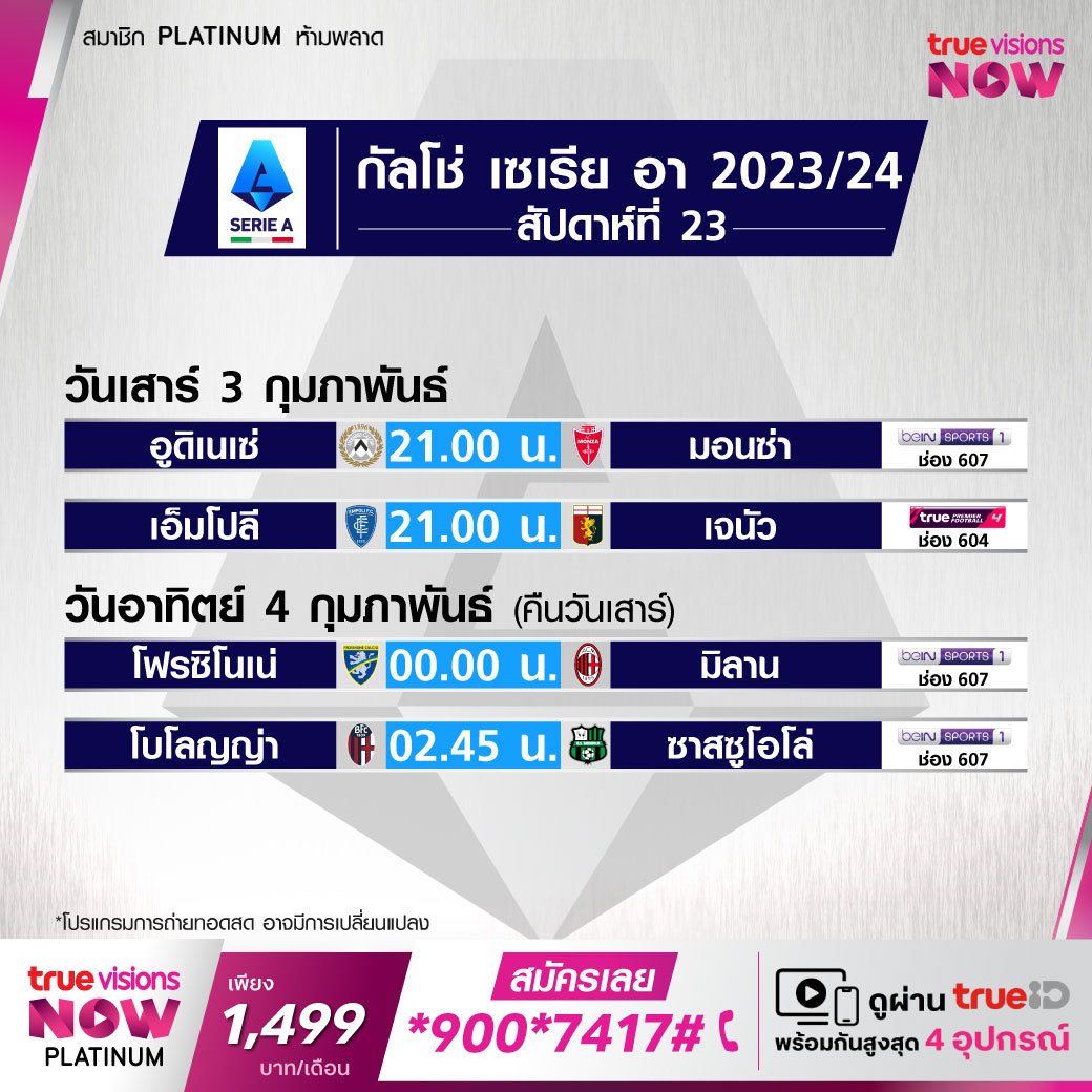 Udinese vs Monza เวลา 21.00-23.00 ทางช่อง beIN 1 (607)