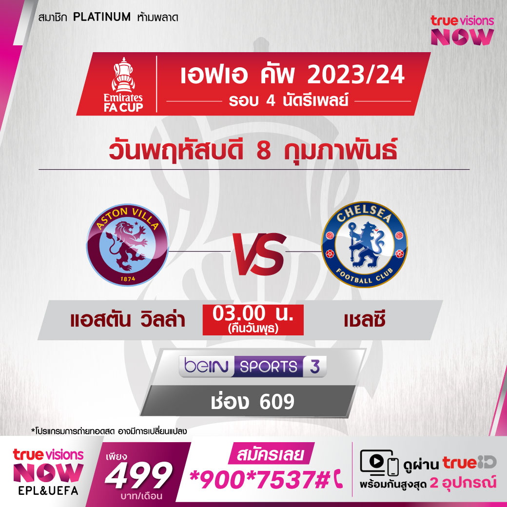 Aston Villa vs Chelsea เวลา 03.00-05.00 ทางช่อง beIN 3 (609)