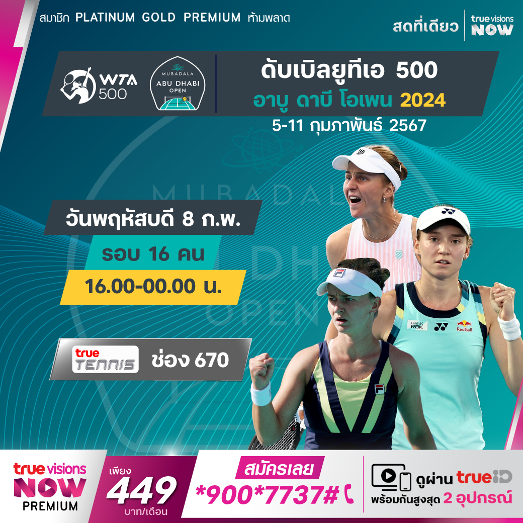 ติดตามชมการแข่งขันเทนนิสหญิง ดับเบิ้ลยูทีเอ ทัวร์ รายการแรกของปี จากภูมิภาคตะวันออกกลาง กับรายการ อาบูดาบี โอเพ่น ที่เมืองอาบูดาบี ประเทศสหรัฐอาหรับเอมิเรตส์ ร่วมลุ้นกันว่าใครจะคว้าแชมป์รายการนี้ไปครอง ติดตามการถ่ายทอดสดครบทุกรอบที่ ทรูวิชั่นส์