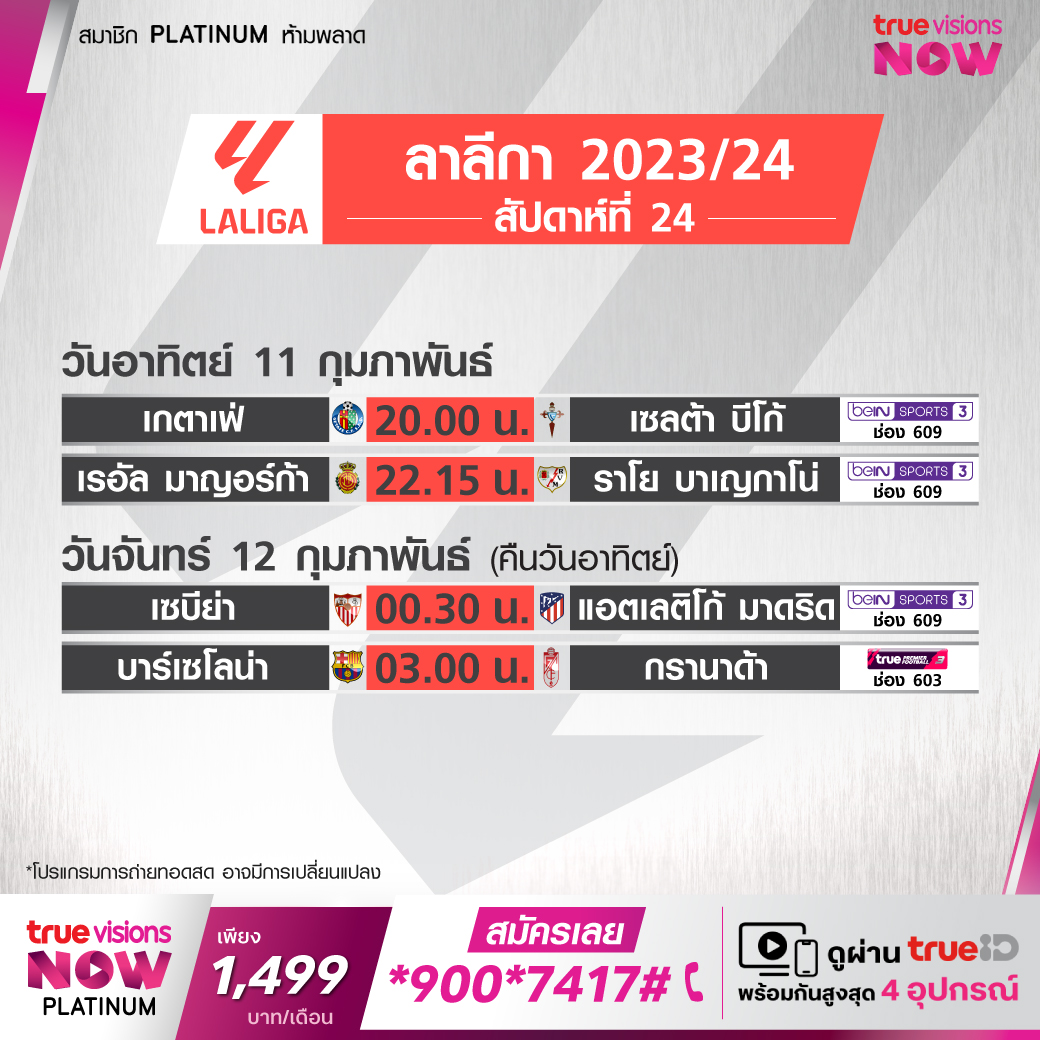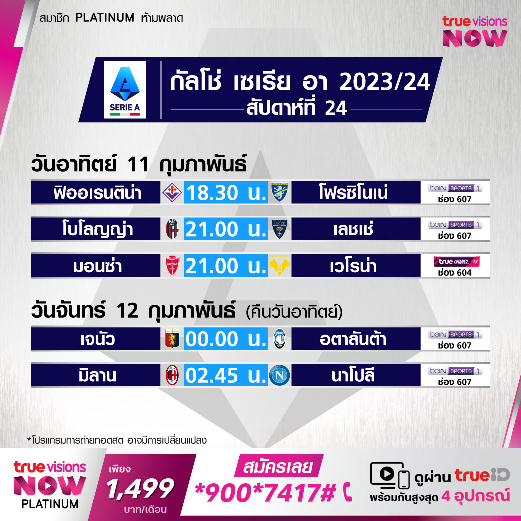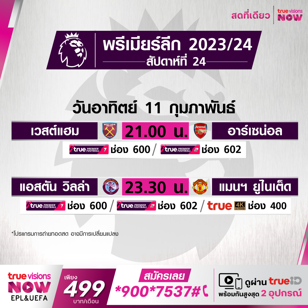 วันนี้มีอะไรดูที่ ทรูวิชั่นส์ ประจำวันอาทิตย์ที่ 11 กุมภาพันธ์ 67 ยังคงมีกีฬาที่น่าสนใจให้ได้ตามลุ้นตามเชียร์มากมายเหมือนเดิม โดยในส่วนของฟุตบอลนั้นยังมีศึกพรีเมียร์ลีก อังกฤษ, กัลโช่ เซเรีย อา อิตาลี, บุนเดสลีกา เยอรมนี, ลา ลีกา สเปน, ลีก เอิง ฝรั่งเศส ให้ได้ตามเชียร์กันต่อ รวมถึงศึกแอฟริกา คัพ ออฟ เนชั่นส์ ที่เดินทางมาถึงในรอบชิงชนะเลิศแล้ว ส่วนกีฬาอื่นๆ ยังมีศึกเทนนิส เอทีพี ทัวร์ รายการ มาร์กเซย โอเพ่น, เทนนิสหญิง ดับเบิ้ลยูทีเอ ทัวร์ รายการ อาบูดาบี โอเพ่น, ทรานซิลวาเนีย โอเพ่น และ กาตาร์ โอเพ่น, กอล์ฟ พีจีเอ ทัวร์ รายการ ฟินิกซ์ โอเพ่น และ ดีพี เวิลด์ ทัวร์ รายการ คอมเมอร์เชียล แบงค์ กาตาร์ มาสเตอร์ส, รักบี้ ซิกซ์ เนชั่นส์ 2024, วอลเลย์บอล โคโว วี-ลีก รวมถึงศึกเอ็นเอฟแอล ซูเปอร์ โบล์ว ครั้งที่ 58 งานนี้ ทรูวิชั่นส์ จัดเต็มให้ชมกันถึงบ้าน