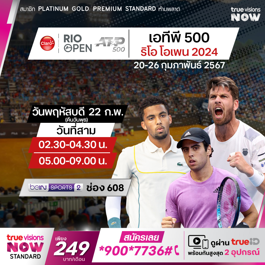 เทนนิสเอทีพี ทัวร์ สัปดาห์นี้ พบกับรายการ ริโอ โอเพ่น การแข่งขันเทนนิสรายการคอร์ทดินระดับ ATP 500 ที่ใหญ่ที่สุดในทวีปอเมริกาใต้ ที่นคร ริโอ เด จาเนโร ประเทศบราซิล เหล่าสตาร์ชื่อดังลงสนามกันคับคั่ง ร่วมลุ้นกันว่าใครจะคว้าแชมป์รายการนี้ไปครอง ชมสด ที่ ทรูวิชั่นส์วันที่สาม เวลา 02.30 -04.30 / 05.00 - 09.00 ทางช่อง beIN 2 (608)