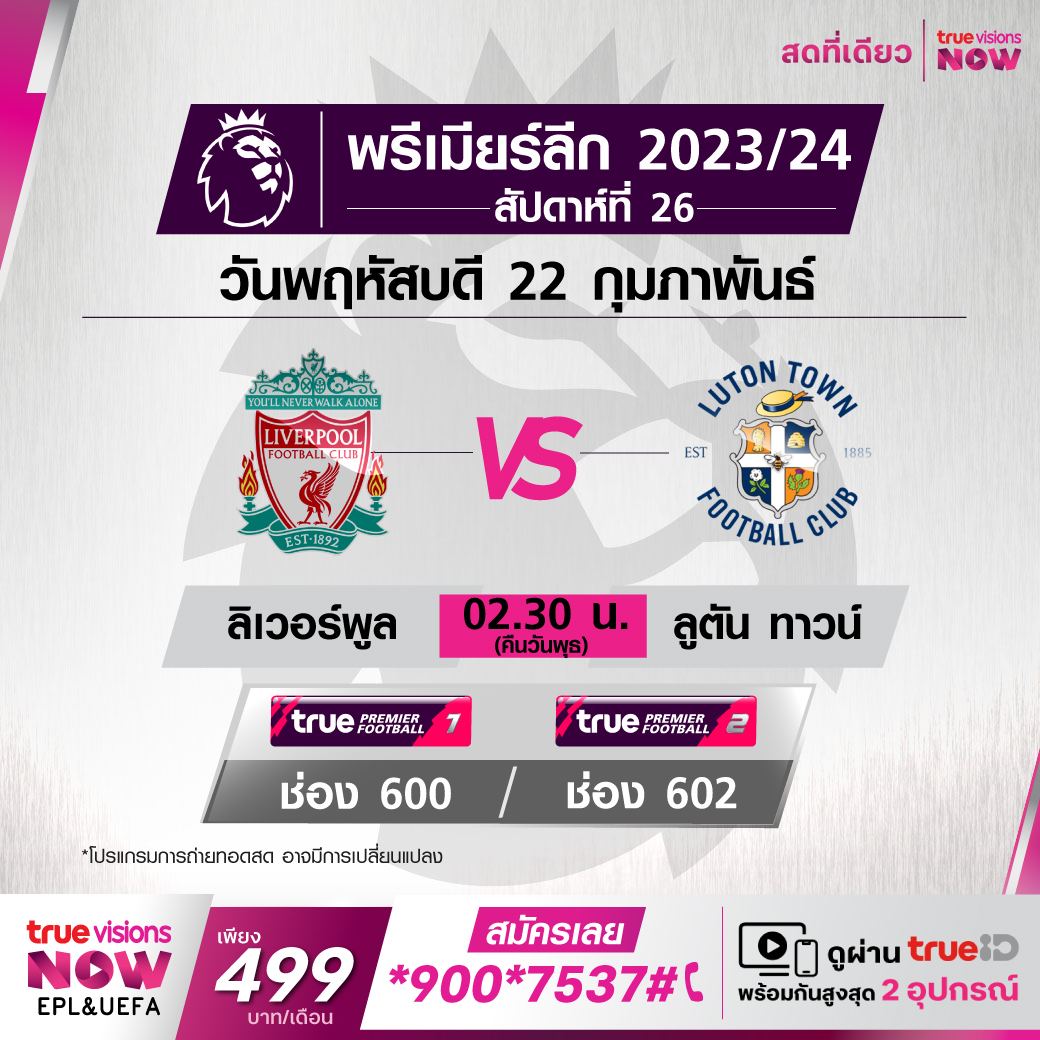 Liverpool vs Luton Town เวลา 02:30 - 04:30 ทางช่อง TPF 1(600) / TPF 2 (602)