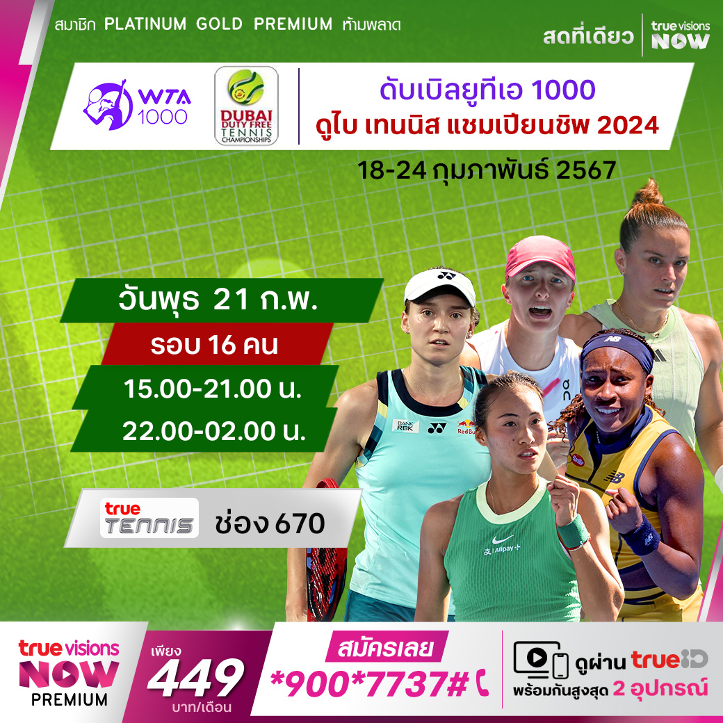 การแข่งขันเทนนิสหญิง ดับเบิ้ลยูทีเอ ทัวร์ ระดับ WTA 1000 ในภูมิภาคตะวันออกกลาง กับรายการ ดูไบ เทนนิส แชมเปี้ยนชิพ ที่เมืองดูไบ ประเทศสหรัฐอาหรับเอมิเรตส์ สตาร์มือดีมากันอย่างคับคั่ง ร่วมลุ้นร่วมเชียร์ว่าใครจะเป็นผู้ที่คว้าแชมป์ไปครอง ชมสด ทางทรูวิชั่นส์ ที่เดียว