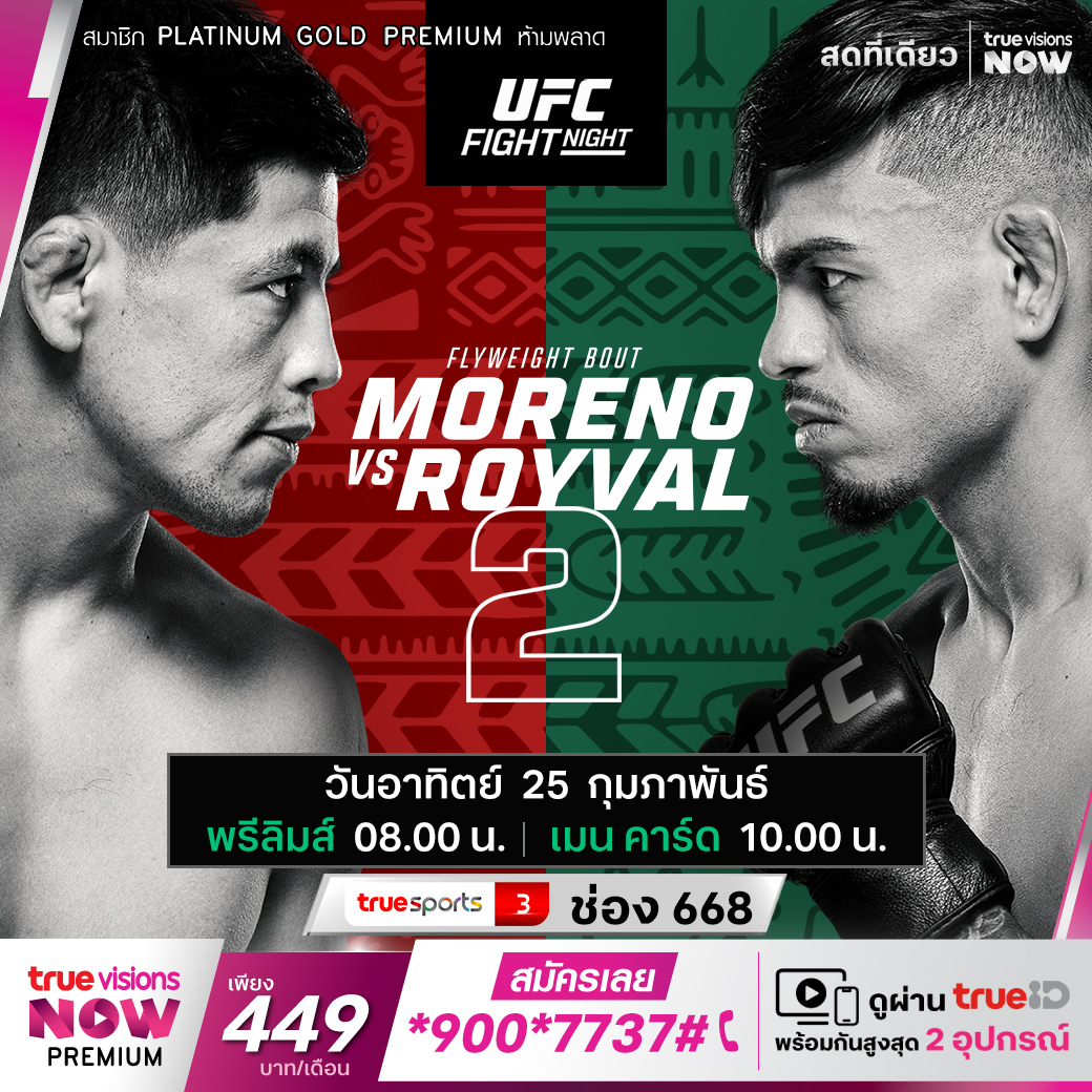 ยูเอฟซี ไฟต์ ไนท์ สัปดาห์นี้ไปสร้างสีสันและติดตามความมันส์กันที่แดนจังโก้ ประเทศเม็กซิโก คู่เอก แบรนดอน โมเรโน่ อดีตแชมป์ฟลายเวต ในฐานะรองแชมป์อันดับ 1 ชาวเม็กซิกัน รีแม็ตช์กับคู่ปรับเก่า แบรนดอน รอยวัล รองแชมป์อันดับ 3 ชาวอเมริกัน ร่วมด้วย ยาย่า ฮ็อดริเกซ ปะทะ ไบรอัน ออร์เทก้า สด เอ็กซ์คลูซีฟ ตั้งแต่ พรีลิมส์ ถึง เมน คาร์ด