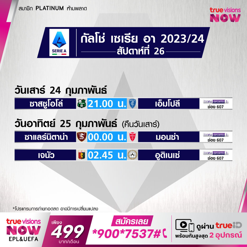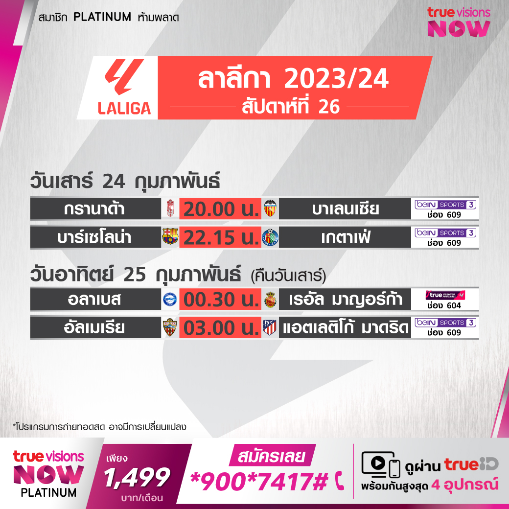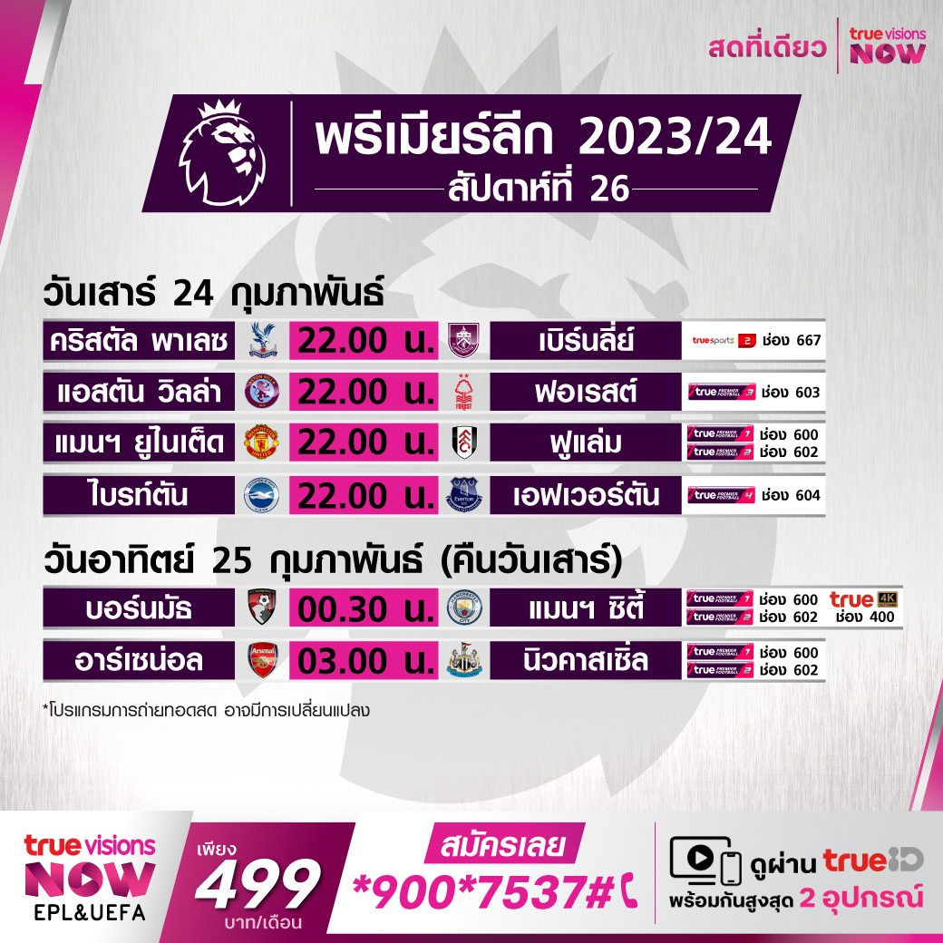 วันนี้มีอะไรดูที่ ทรูวิชั่นส์ ประจำวันเสาร์ที่ 24 กุมภาพันธ์ 67 ยังคงมีกีฬาที่น่าสนใจให้ได้ตามลุ้นตามเชียร์มากมายเหมือนเดิม โดยในส่วนของฟุตบอลนั้นยังมีศึกพรีเมียร์ลีก อังกฤษ, กัลโช่ เซเรีย อา อิตาลี, บุนเดสลีกา เยอรมนี, ลา ลีกา สเปน และ ลีก เอิง ฝรั่งเศส ให้ได้ตามเชียร์กันต่อ ส่วนกีฬาอื่นๆ ยังมีศึกเทนนิส เอทีพี ทัวร์ รายการ ริโอ โอเพ่น โอเพ่น, เทนนิสหญิง ดับเบิ้ลยูทีเอ ทัวร์ รายการ ดูไบ เทนนิส แชมเปี้ยนชิพ, กอล์ฟ พีจีเอ ทัวร์ รายการ เม็กซิโก โอเพ่น, พีจีเอ ทัวร์ แชมเปี้ยนส์ รายการ โทรฟี่ ฮัสซัน เดอะ เซคันด์, ดีพี เวิลด์ ทัวร์ รายการ เคนย่า โอเพ่น, กอล์ฟหญิง แอลพีจีเอ ทัวร์ รายการ ฮอนด้า แอลพีจีเอ ไทยแลนด์, ศึกยูเอฟซี ไฟต์ ไนท์, ศึกรักบี้ ซิกซ์ เนชั่นส์, ศึกเวิลด์ สนุกเกอร์ ทัวร์ รายการ เพลเยอร์ส แชมเปี้ยนชิพ และศึกบาสเกตบอลเอ็นบีเอ งานนี้ ทรูวิชั่นส์ จัดเต็มให้ชมกันถึงบ้าน