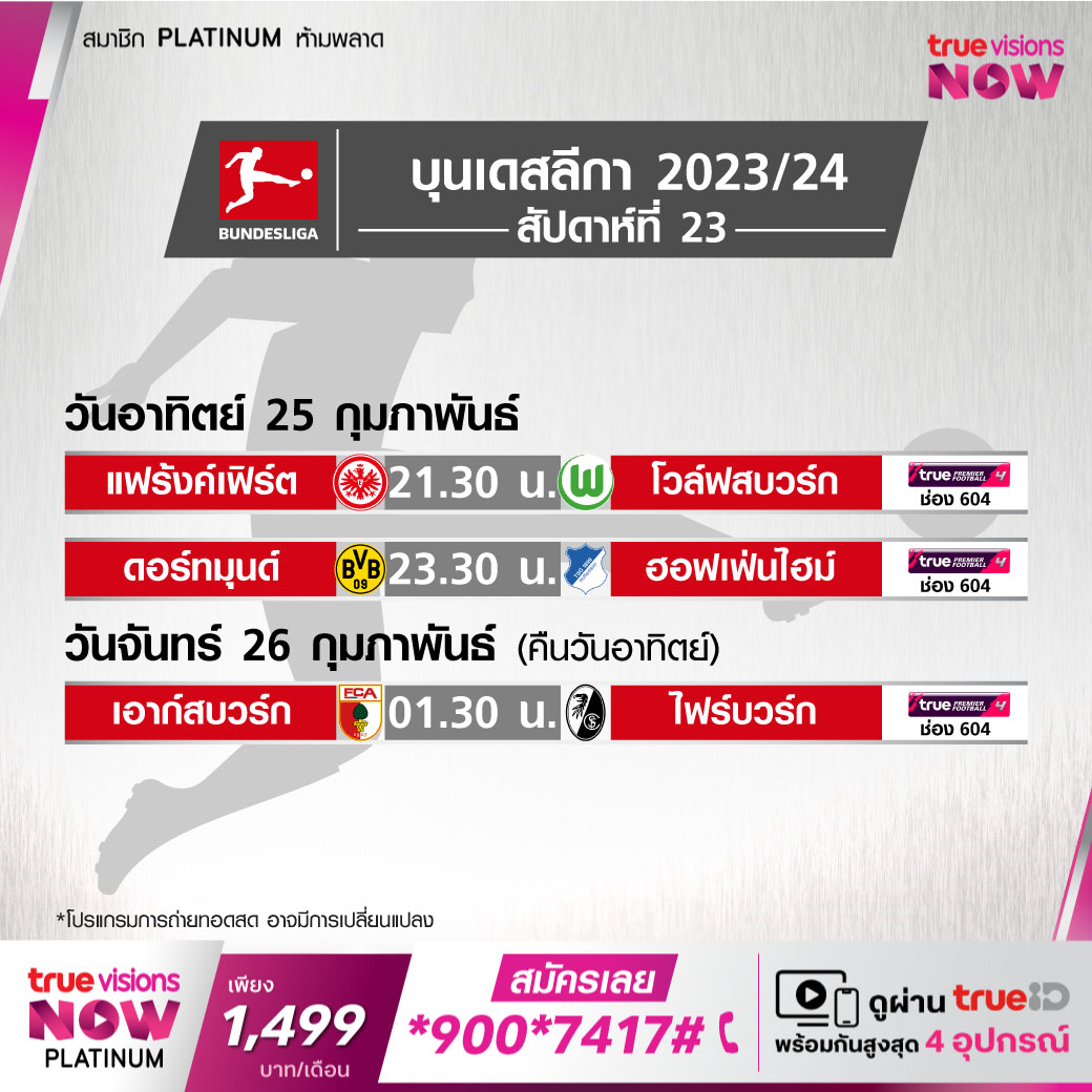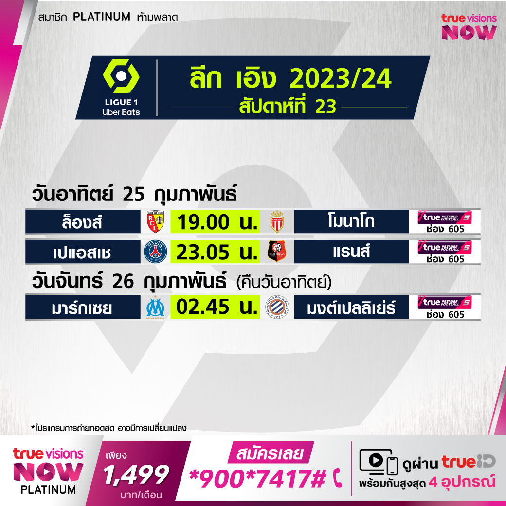 วันนี้มีอะไรดูที่ ทรูวิชั่นส์ ประจำวันอาทิตย์ที่ 25 กุมภาพันธ์ 67 ยังคงมีกีฬาที่น่าสนใจให้ได้ตามลุ้นตามเชียร์มากมายเหมือนเดิม โดยในส่วนของฟุตบอลนั้นยังมีศึกพรีเมียร์ลีก อังกฤษ, กัลโช่ เซเรีย อา อิตาลี, บุนเดสลีกา เยอรมนี, ลา ลีกา สเปน, ลีก เอิง ฝรั่งเศส และ ซาอุดิ โปร ลีก ให้ได้ตามเชียร์กันต่อ ส่วนกีฬาอื่นๆ ยังมีศึกเทนนิส เอทีพี ทัวร์ รายการ ริโอ โอเพ่น โอเพ่น, กอล์ฟ พีจีเอ ทัวร์ รายการ เม็กซิโก โอเพ่น, ดีพี เวิลด์ ทัวร์ รายการ เคนย่า โอเพ่น, กอล์ฟหญิง แอลพีจีเอ ทัวร์ รายการ ฮอนด้า แอลพีจีเอ ไทยแลนด์, วอลเลย์บอลลีกหญิง โคโว วี-ลีก, ศึกรักบี้ ซิกซ์ เนชั่นส์ และศึกเวิลด์ สนุกเกอร์ ทัวร์ รายการ เพลเยอร์ส แชมเปี้ยนชิพ งานนี้ ทรูวิชั่นส์ จัดเต็มให้ชมกันถึงบ้าน