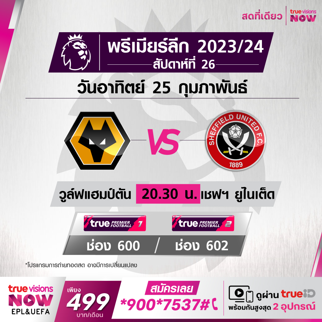 Wolverhampton vs Sheffield United เวลา 20:30 - 22:30 ทางช่อง TPF 1(600) / TPF 2 (602)