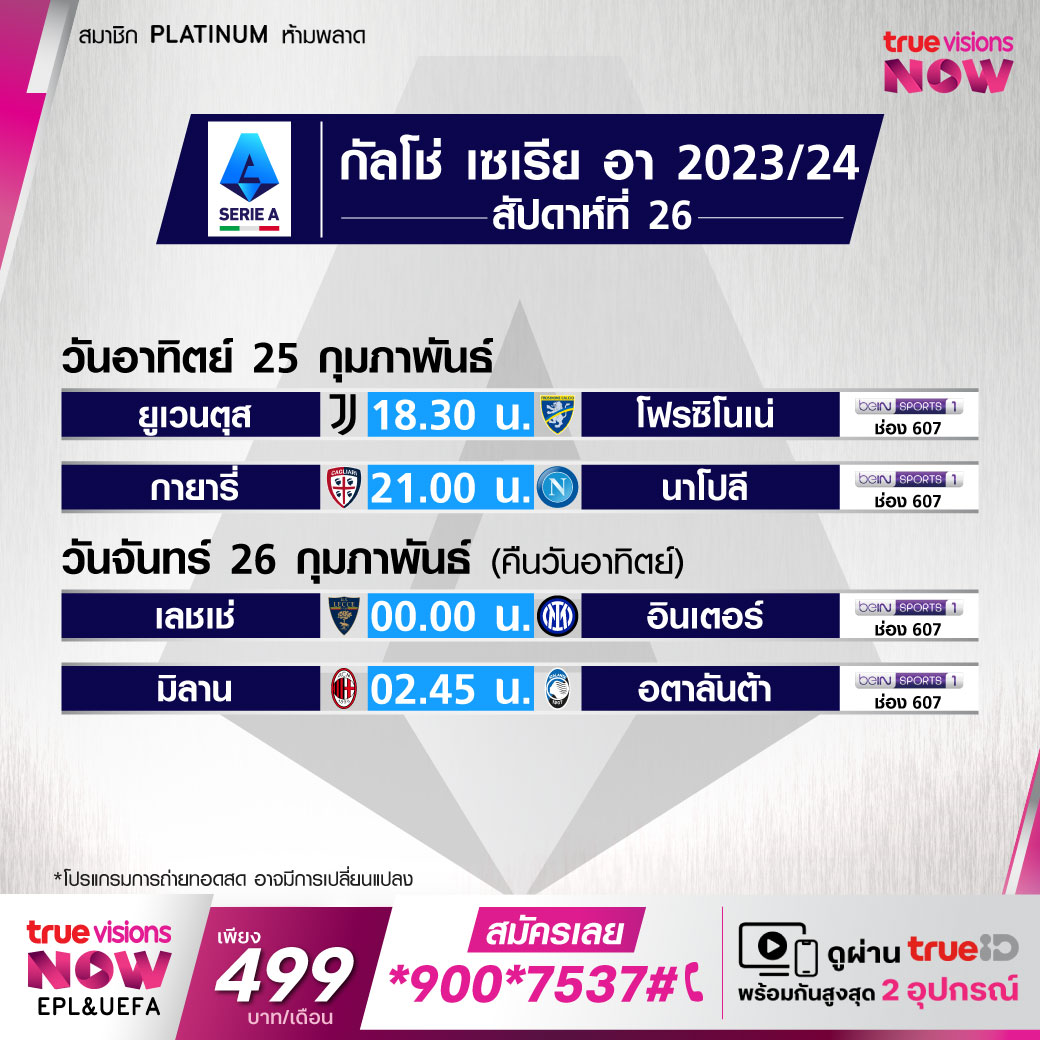 Lecce vs Inter เวลา 00.00-02.00 ทางช่อง beIN 1 (607)