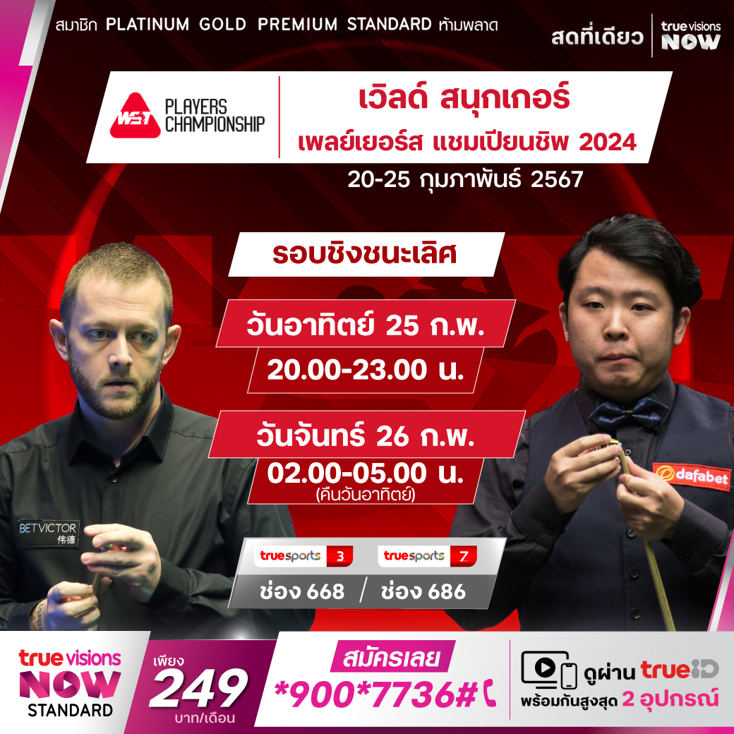 ความมันส์ของศึกสอยคิวเก็บคะแนนสะสมโลก เริ่มเข้มข้นเร้าใจขึ้นไปทุกขณะ สัปดาห์นี้ แฟนๆ จะได้สัมผัสประสบการณ์ระดับโลกจากนักสนุกเกอร์ขั้นเทพของวงการ 16 คน จาก เวิลด์ แรงค์กิ้ง ที่ดีที่สุดในฤดูกาลนี้ เพื่อแย่งแชมป์ เพลเยอร์ส แชมเปี้ยนชิพ 2024 สดเอ็กซ์คลูซีฟ ครบทุกแมตช์จาก เทลฟอร์ด อินเตอร์เนชั่นแนล เซนเตอร์ ประเทศอังกฤษ ชมสด ที่ ทรูวิชั่นส์ ที่เดียว