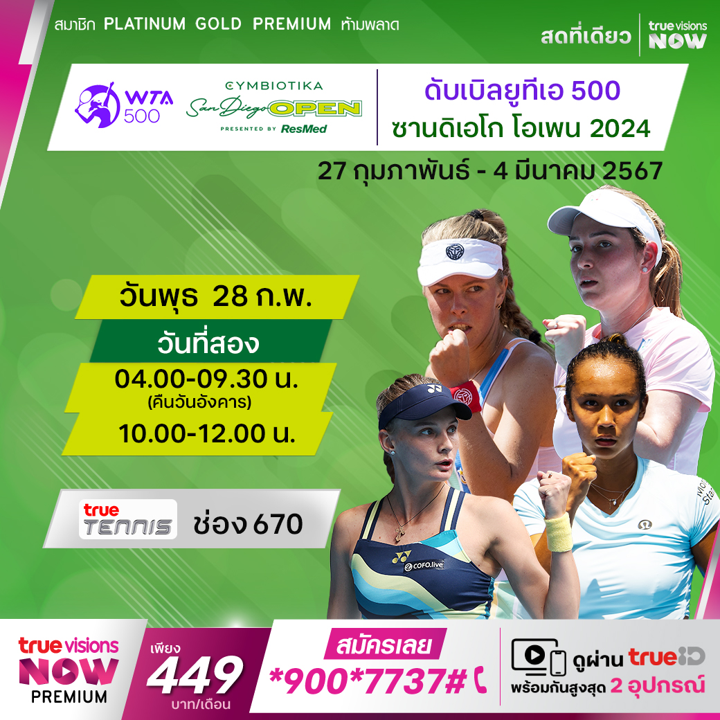 เทนนิสหญิง ดับเบิ้ลยูทีเอ ทัวร์ สัปดาห์นี้พบกับรายการ ซาน ดีเอโก้ โอเพ่น ซึ่งถือเป็นรายการแรกบนแผ่นดินอเมริกาในปี 2024 ที่เมือง ซาน ดีเอโก รัฐแคลิฟอร์เนีย นำโดย เจสซีกา เปกูล่า นักเทนนิสสาวชาวอเมริกัน ร่วมลุ้นกันว่าใครจะคว้าแชมป์รายการนี้ไปครอง ชมสด ที่ ทรูวิชั่นส์วันที่สอง เวลา 04.00-09.30 / 10.00-12.00 ทางช่อง True Tennis (670)