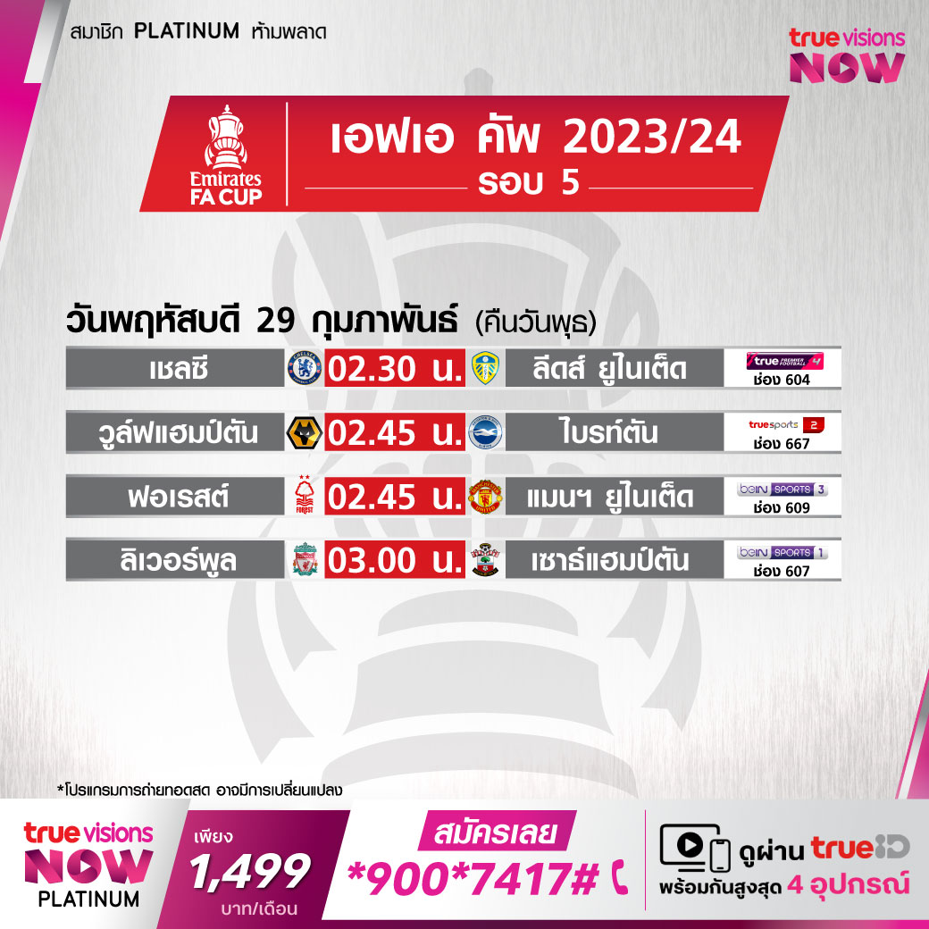 วันนี้มีอะไรดูที่ ทรูวิชั่นส์ ประจำวันพุธที่ 28 กุมภาพันธ์ 67 ยังคงมีกีฬาที่น่าสนใจให้ได้ตามลุ้นตามเชียร์มากมายเหมือนเดิม โดยในส่วนของฟุตบอลนั้นยังมีศึกเอฟเอ คัพ อังกฤษ และ กัลโช่ เซเรีย อา อิตาลี ให้ได้ตามเชียร์กันต่อ ส่วนกีฬาอื่นๆ ยังมีศึกเทนนิส เอทีพี ทัวร์ รายการ ดูไบ เทนนิส แชมเปี้ยนชิพ, เอทีพี ทัวร์ รายการ เม็กซิกัน โอเพ่น, ดับเบิ้ลยูทีเอ ทัวร์ รายการ ซาน ดีเอโก้ โอเพ่น และศึกวอลเลย์บอลลีกหญิง โคโว วี-ลีก งานนี้ ทรูวิชั่นส์ จัดเต็มให้ชมกันถึงบ้าน