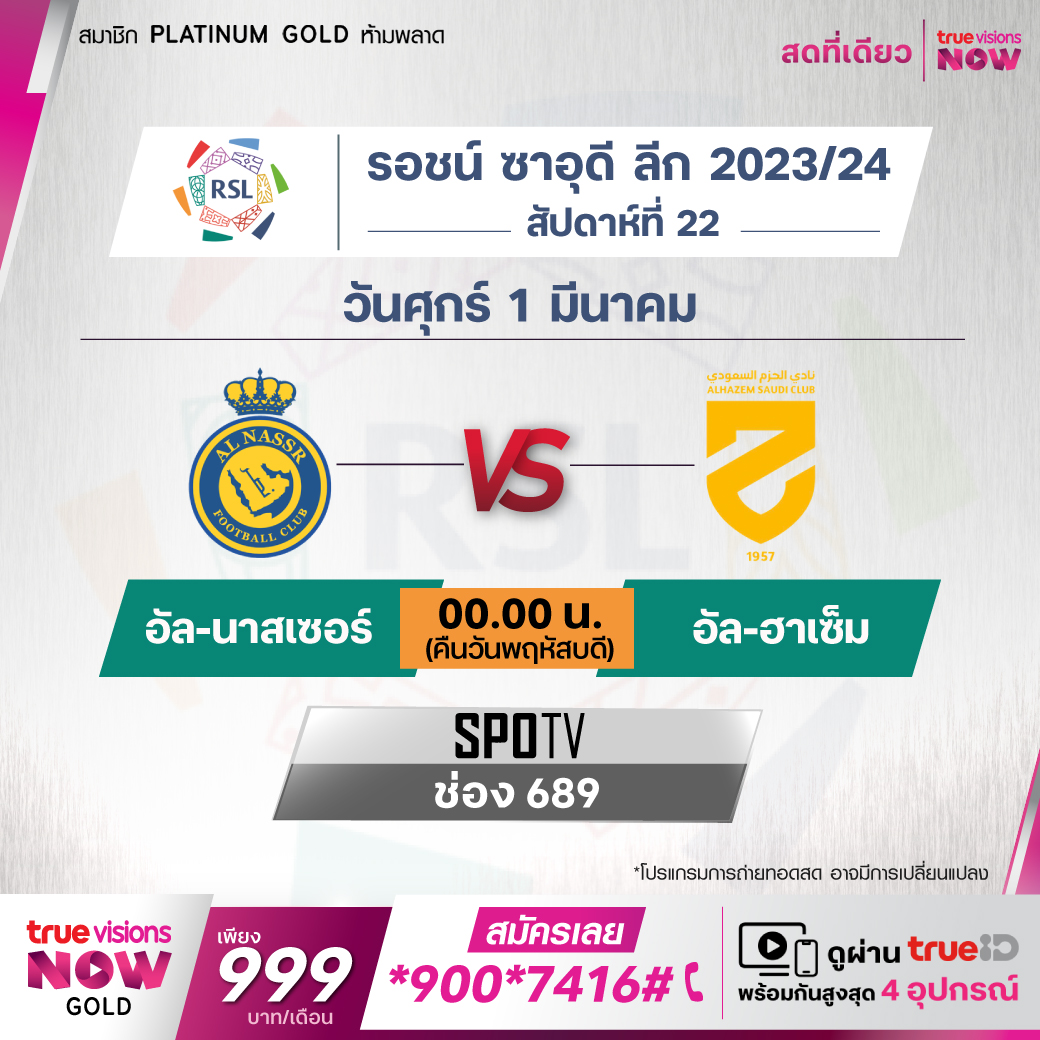 Al-Nassr vs Al-Hazem เวลา 00.00-02.00 ทางช่อง SPOTV (689)