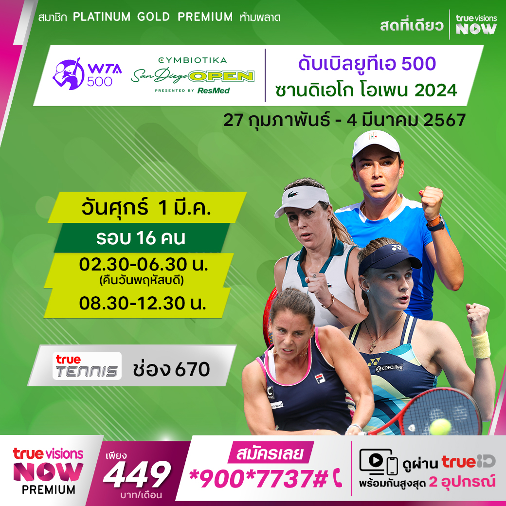 เทนนิสหญิง ดับเบิ้ลยูทีเอ ทัวร์ สัปดาห์นี้พบกับรายการ ซาน ดีเอโก้ โอเพ่น ซึ่งถือเป็นรายการแรกบนแผ่นดินอเมริกาในปี 2024 ที่เมือง ซาน ดีเอโก รัฐแคลิฟอร์เนีย นำโดย เจสซีกา เปกูล่า นักเทนนิสสาวชาวอเมริกัน ร่วมลุ้นกันว่าใครจะคว้าแชมป์รายการนี้ไปครอง ชมสด ที่ ทรูวิชั่นส์