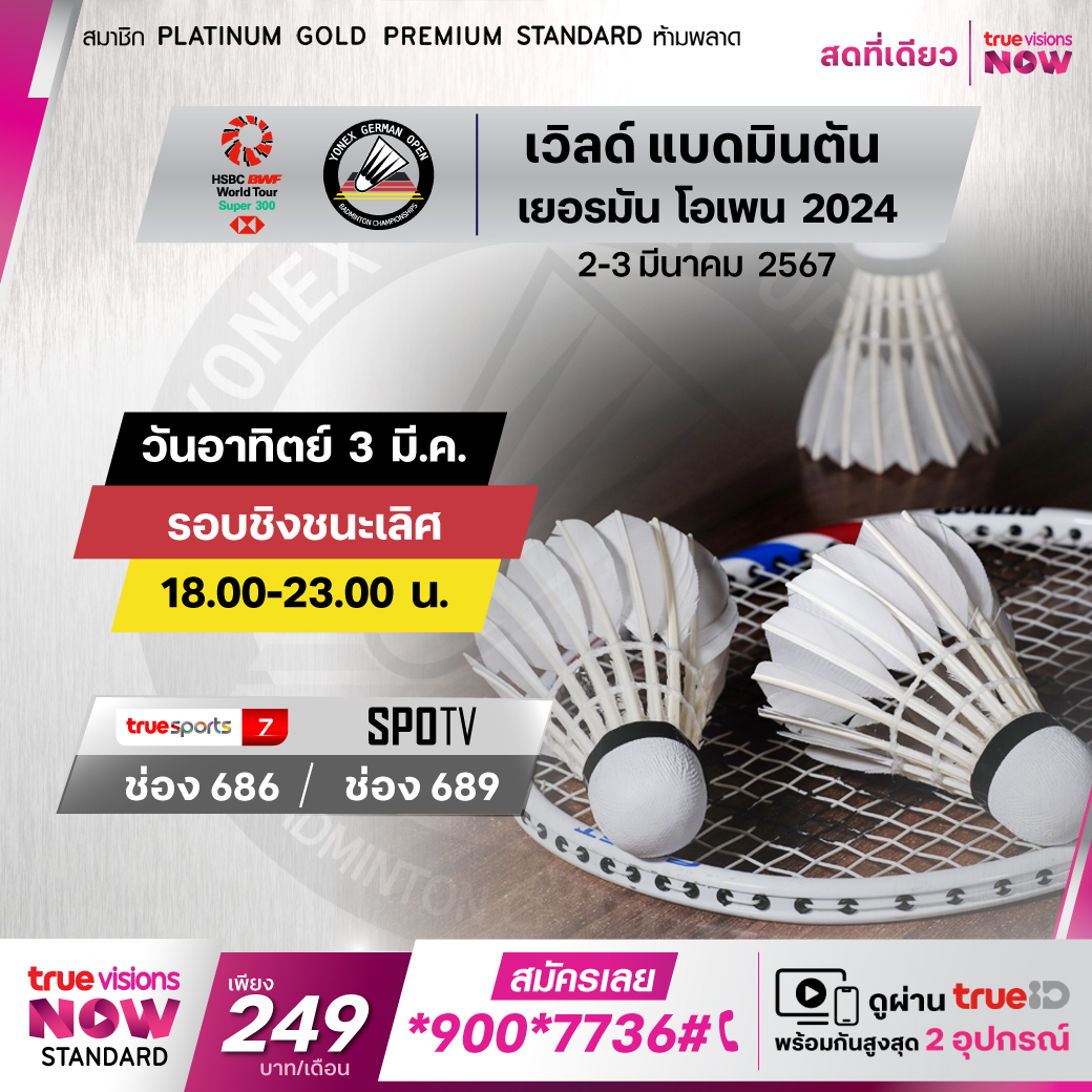 แบดมินตัน บีดับเบิ้ลยูเอฟ เวิลด์ ทัวร์ ซูเปอร์ 300 รายการ เยอรมัน โอเพ่น 2024 ที่ประเทศเยอรมนี ร่วมเชียร์ทีมแบดมินตันของไทยสู้กับมือระดับโลก แย่งกันทำผลงานเพื่อตำแหน่งแชมป์ สด เอ็กซ์คลูซีฟ ที่เดียวที่ ทรูวิชั่นส์