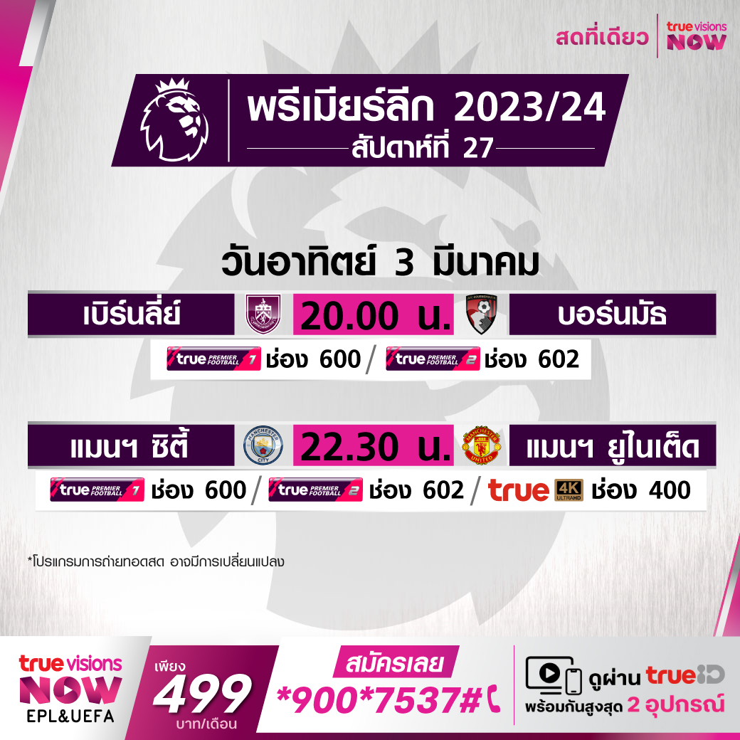 Man City vs Man Utd เวลา 22:30 - 00:30 ทางช่อง TPF 1(600) / TPF 2 (602) / 4K (400)