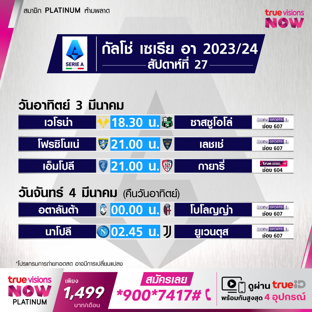 Atalanta vs Bologna เวลา 00.00-02.00 ทางช่อง beIN 1 (607)