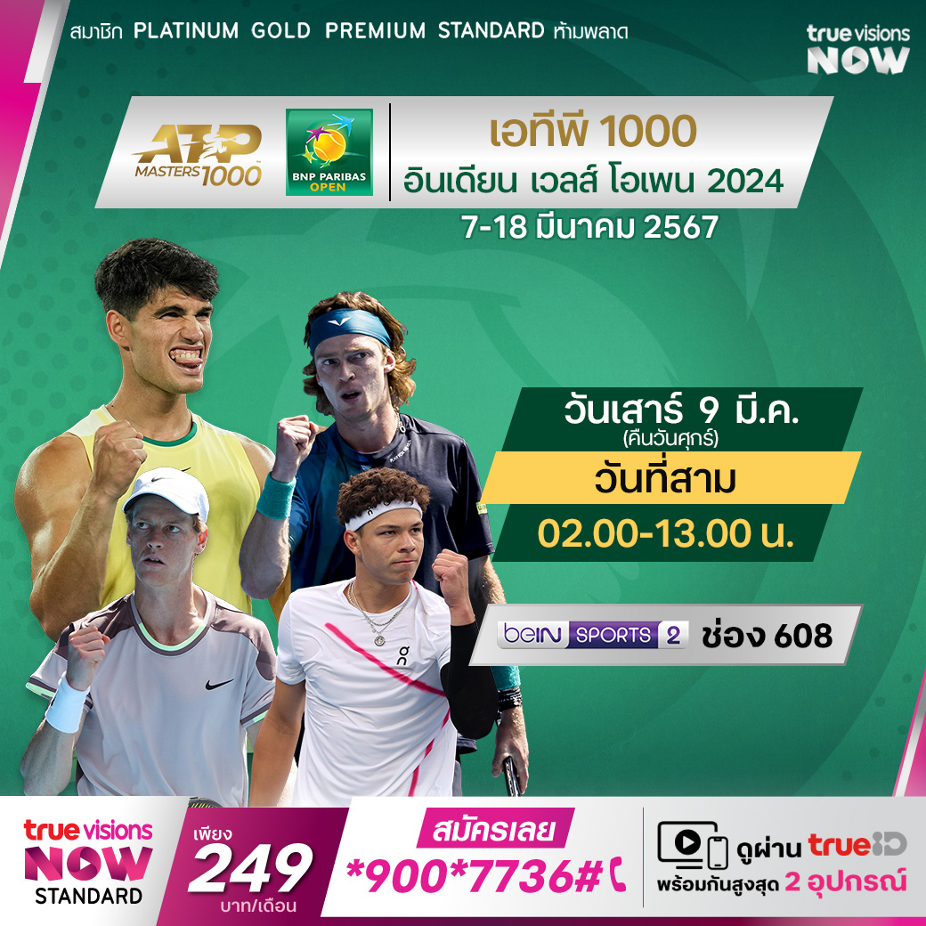 เทนนิส เอทีพี ทัวร์ รายการใหญ่ ที่ได้รับการยกย่องระดับ "แกรนด์สแลมที่ 5 ของปี" ในศึก อินเดียน เวลส์ โอเพ่น นำมาโดยสตาร์ดังอย่าง โนวัค ยอโควิช, ราฟาเอล นาดาล และแชมป์เก่าอย่าง คาร์ลอส อัลคาราซ จากสเปน และ ยานนิค ซินเนอร์ นักเทนนิสที่มาแรงที่สุดในยุคนี้ ร่วมลุ้นว่า ใครจะคว้าแชมป์ไปครอง ดูสดที่ ทรูวิชั่นส์